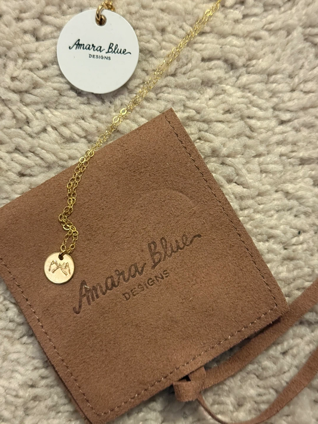 This is a cute gold necklace from Amara Blue Designs. It comes with its original pouch!