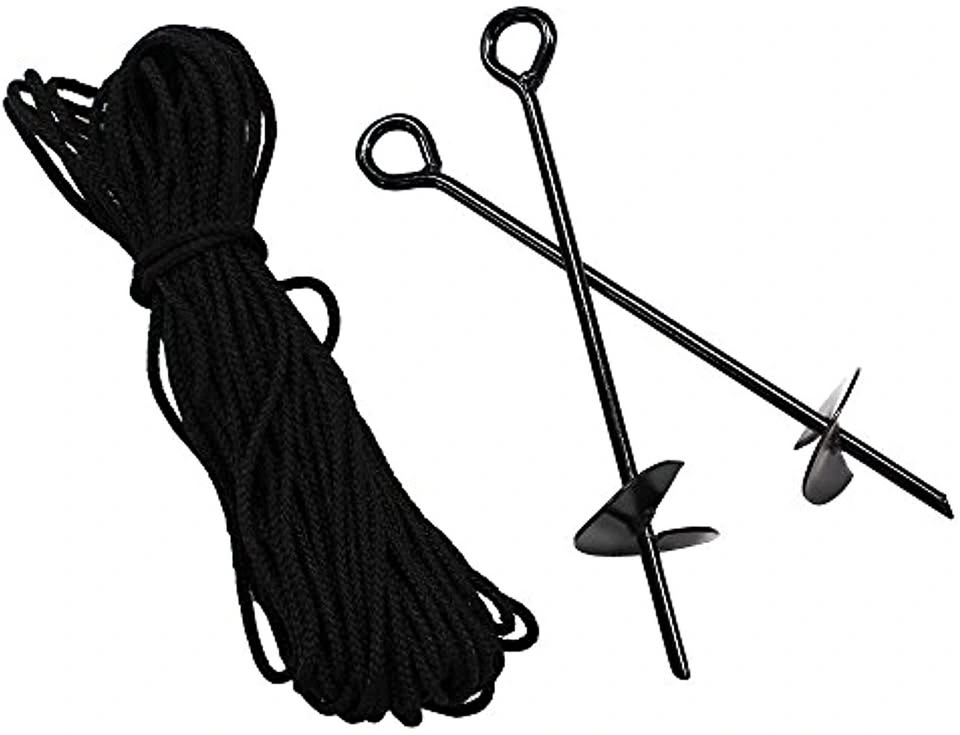 24- Powder Coated Black Steel - 15-Inch Anchor hand screws in to ground. - Tie guy rope through loop to attach to canopy. Let me know if you're interested!