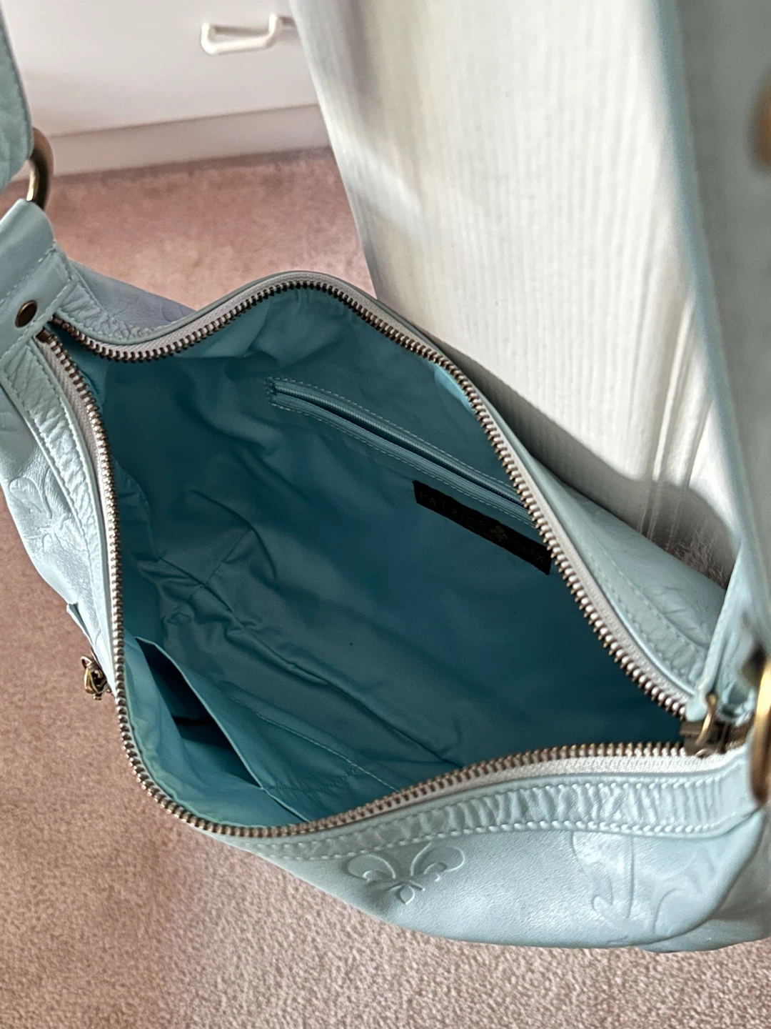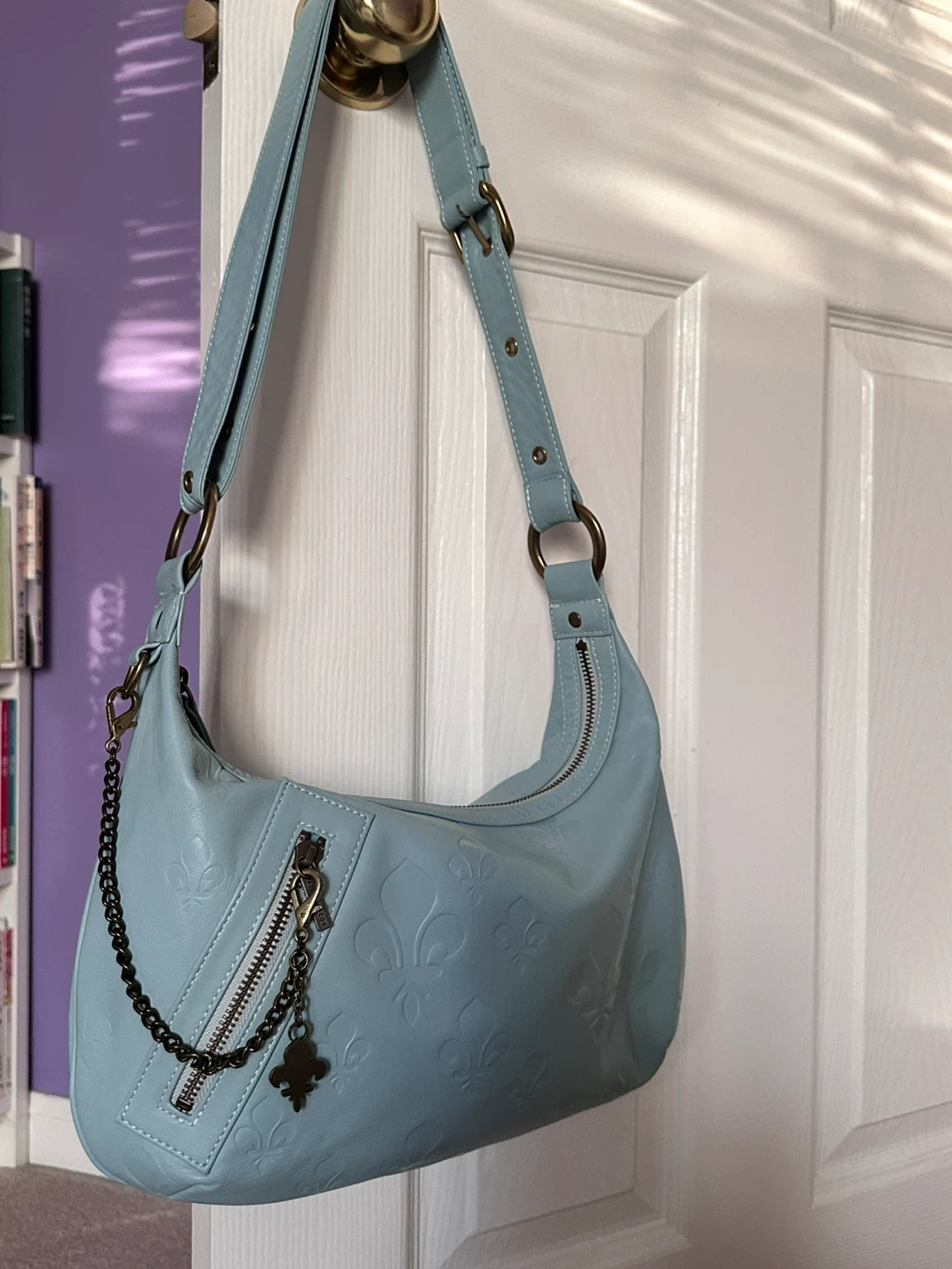 Selling a cute light blue leather hobo bag! It's in great condition and has a unique fleur-de-lis pattern embossed on the leather. Perfect for adding a pop of colour to your outfit!