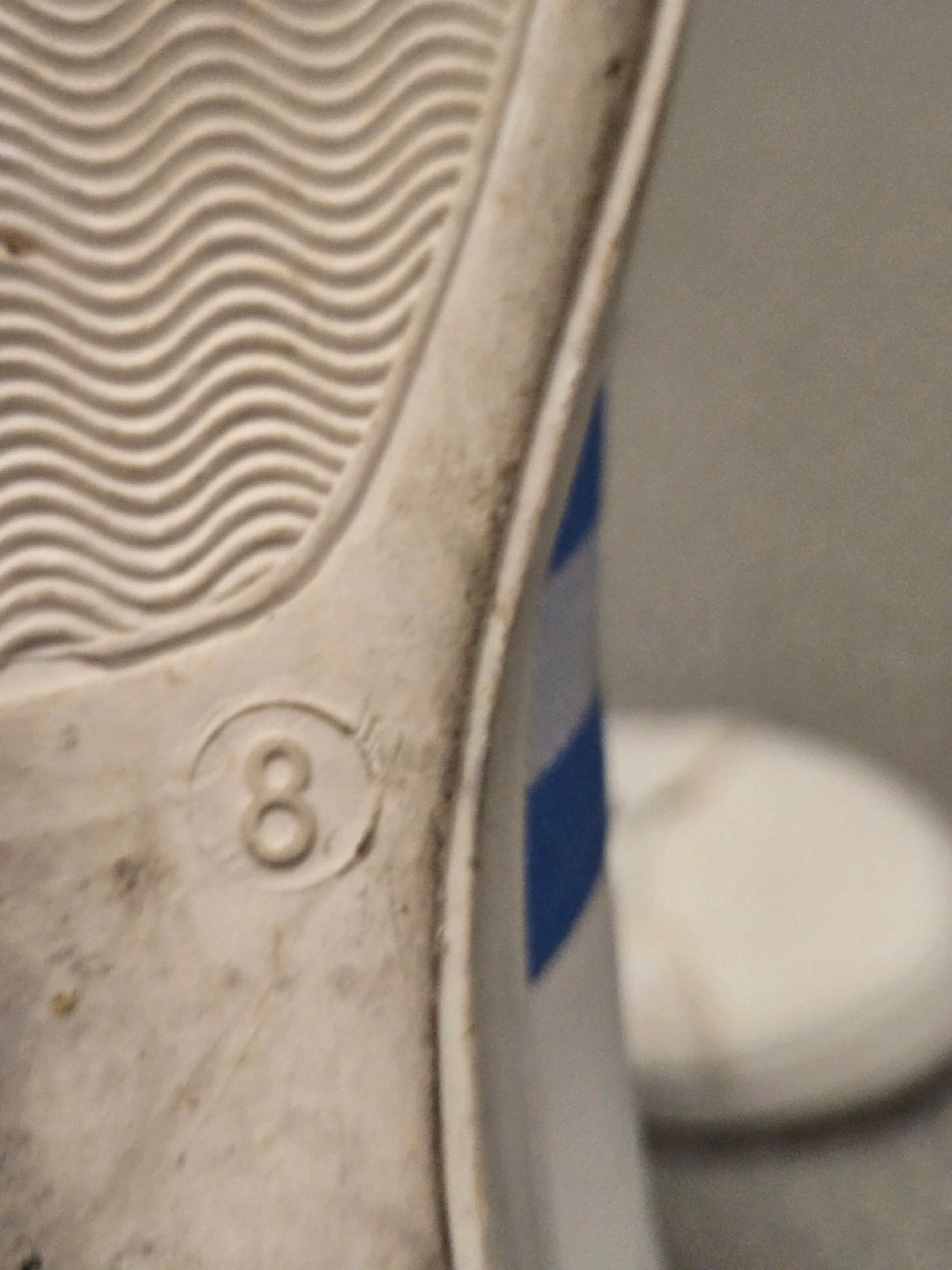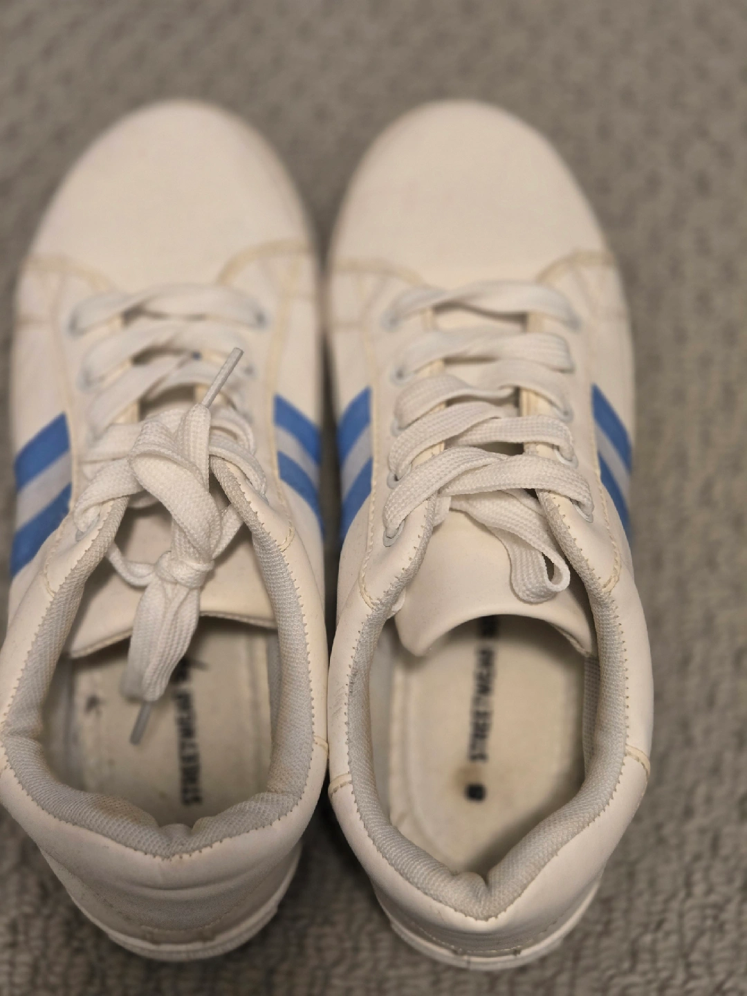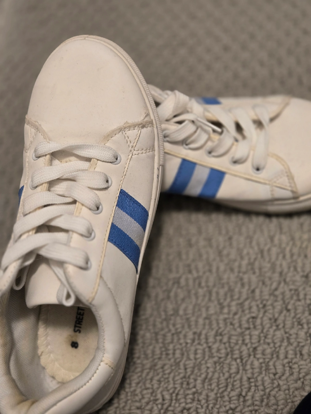 10Selling a pair of Streetwear sneakers in size 8. They're white with blue stripes and have laces. They're in used condition, but still have lots of life left!