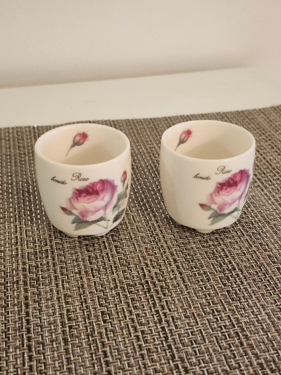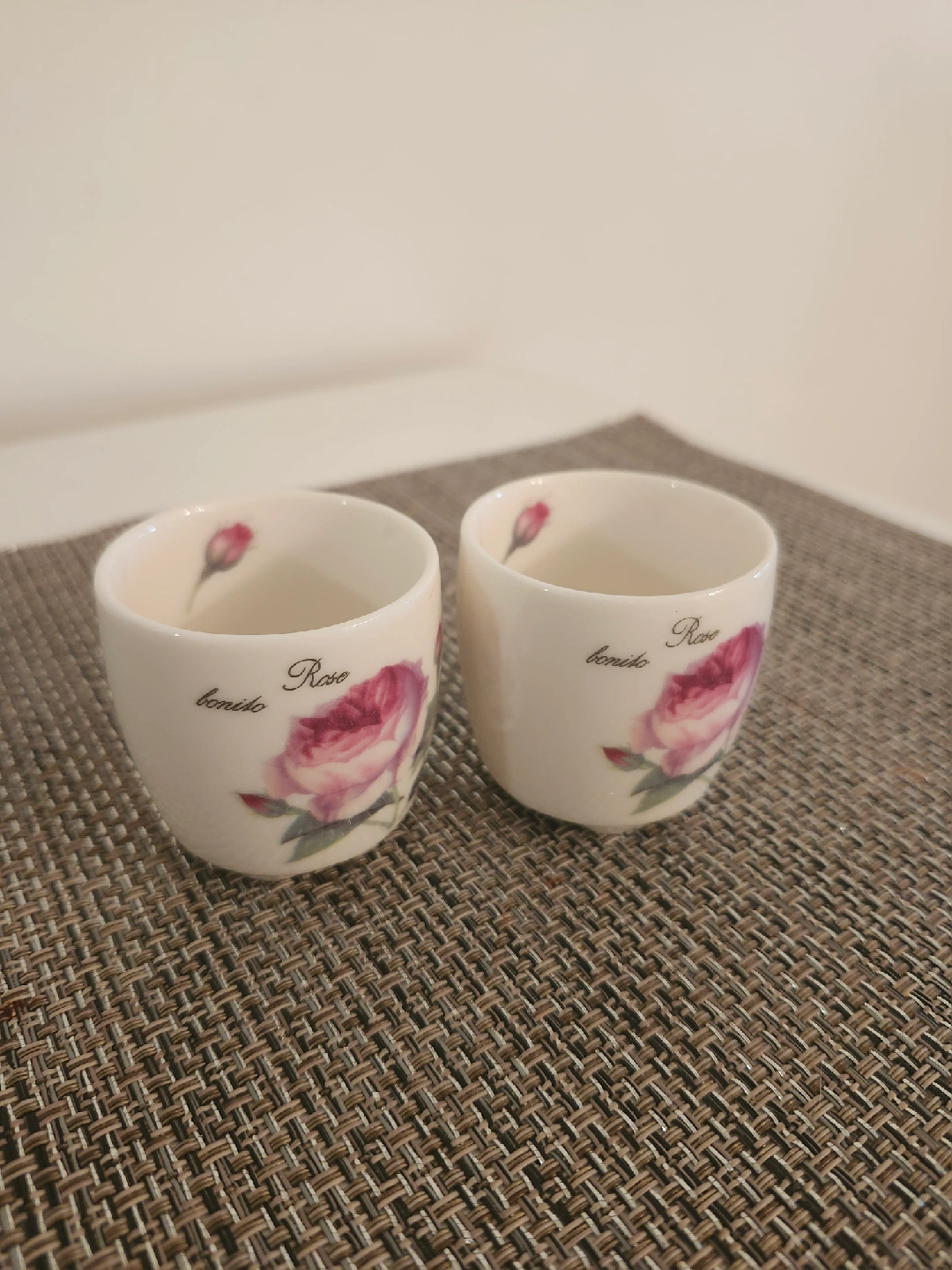 316Here's a set of two adorable tea cups! They have a beautiful rose design and the words 'bonito Rose' and 'SouvNear' printed on them. Perfect for a cozy tea time