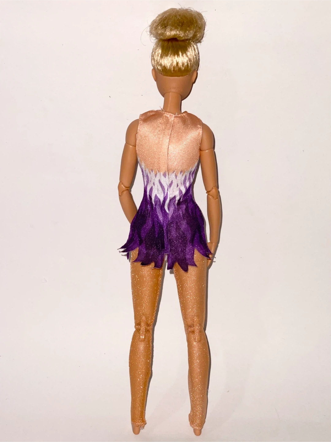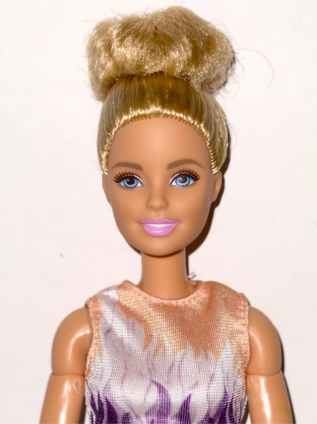 Here's a Barbie doll in a unique outfit! She has blonde hair styled in a bun and is wearing a dress with a purple and white design. Perfect for collectors or kids who love playing with dolls!