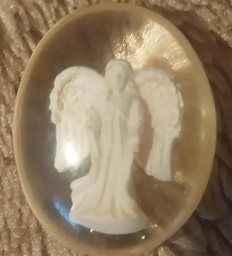 Here's a lovely angel cameo in glass! It features an angel figure encased in a clear, slightly iridescent setting. It would add a nice touch to any collection