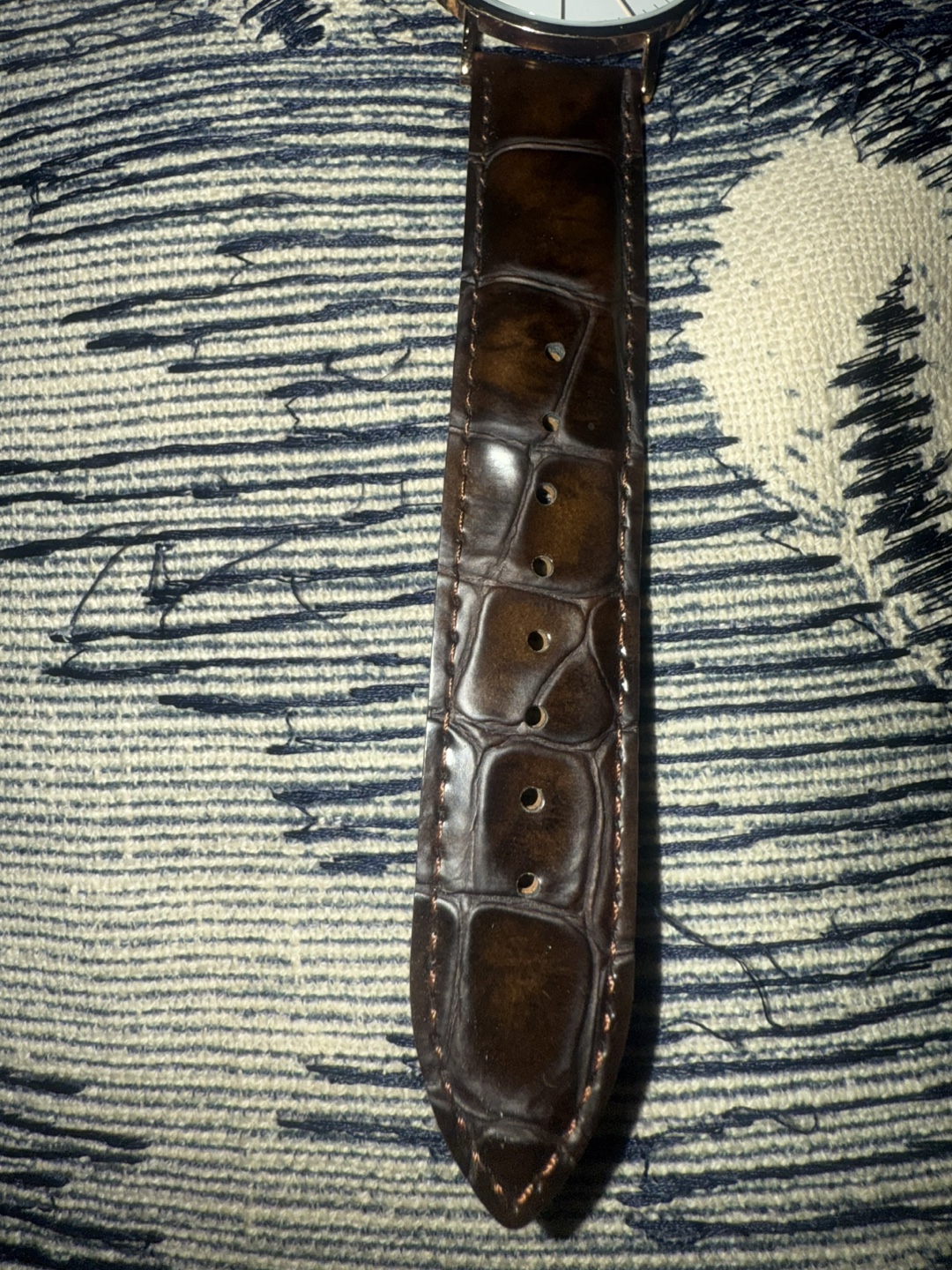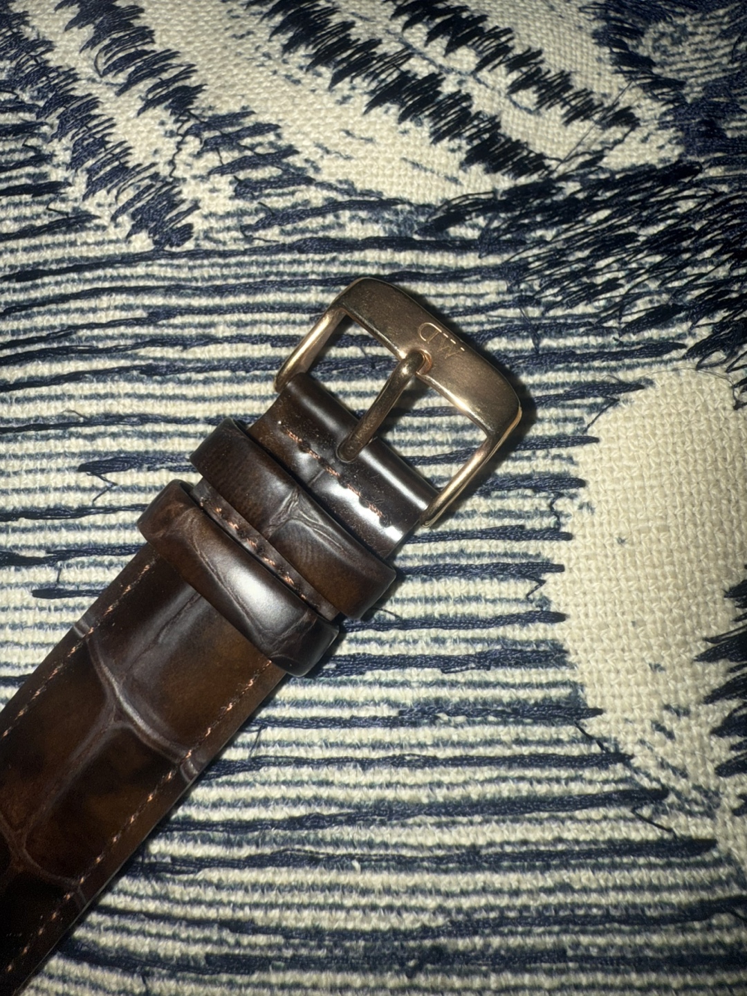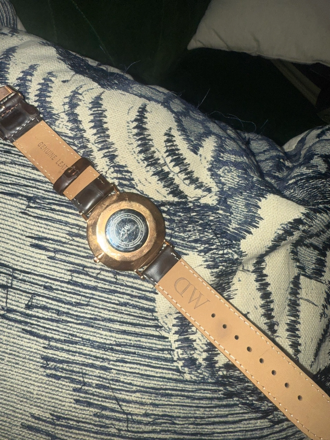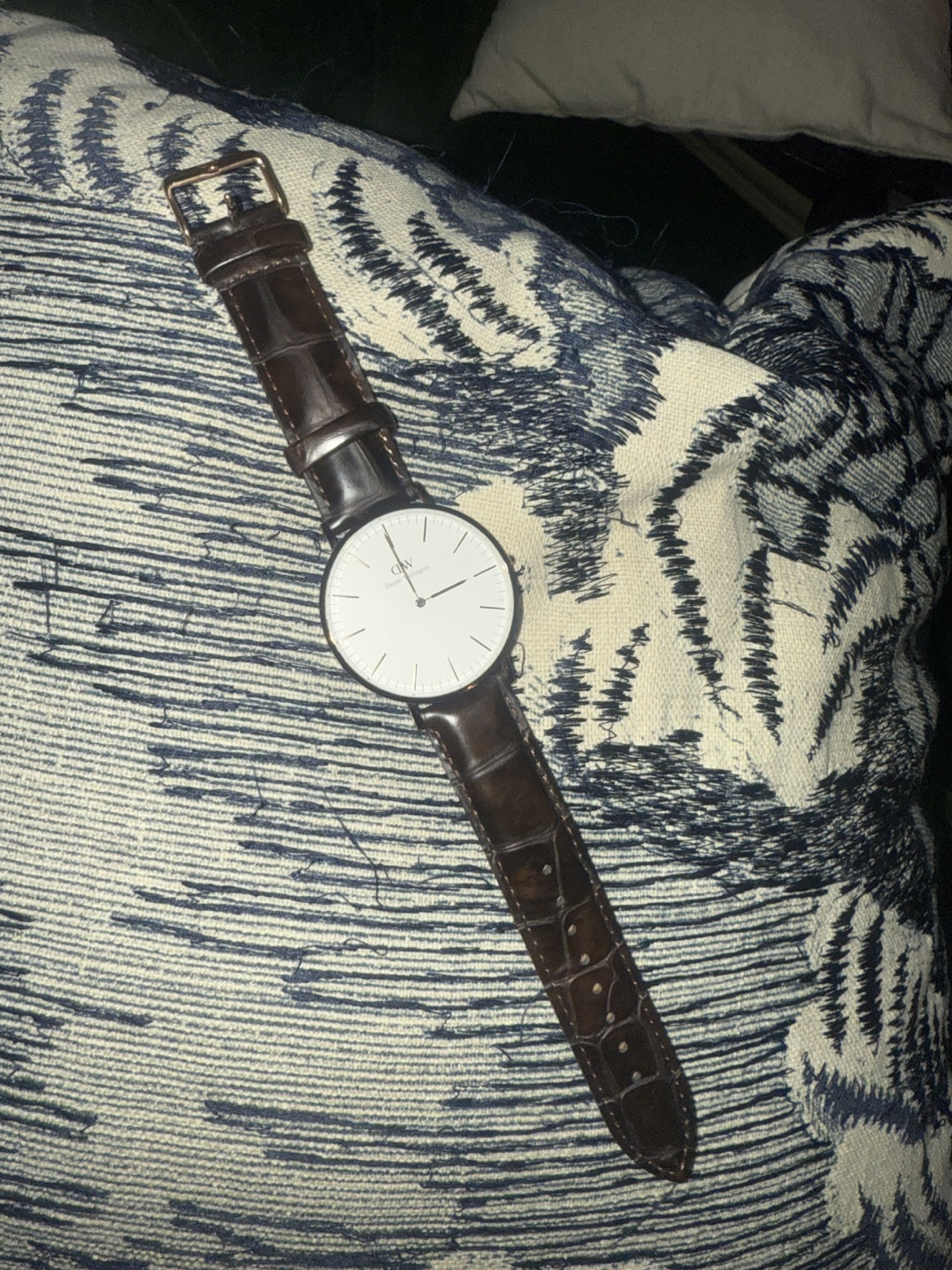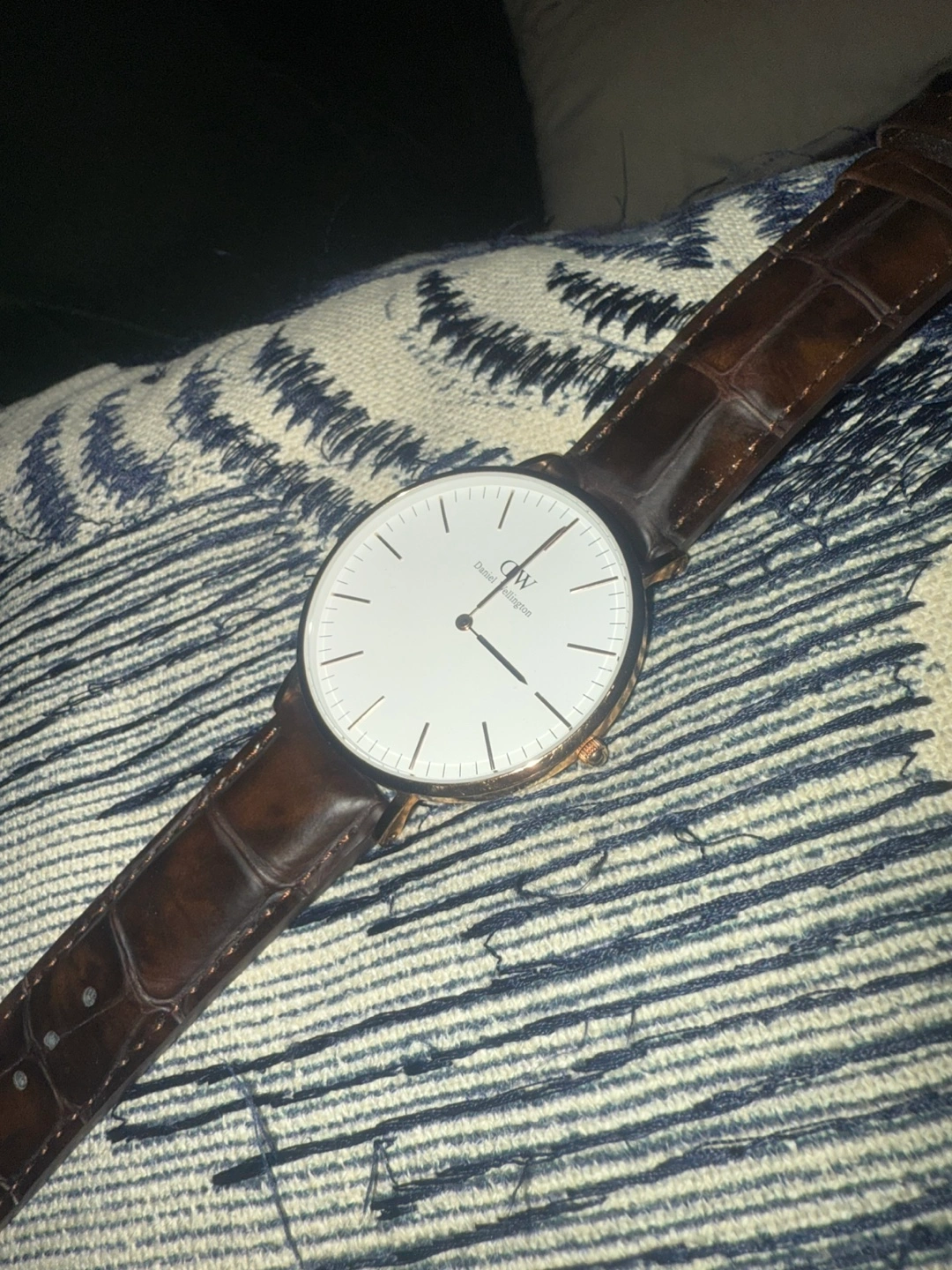 Selling a Daniel Wellington watch with a brown leather band. It's in good condition and has a classic, minimalist design. The band has a crocodile pattern. Perfect for everyday wear! Need a battery change. Pick up from queens Elmhurst