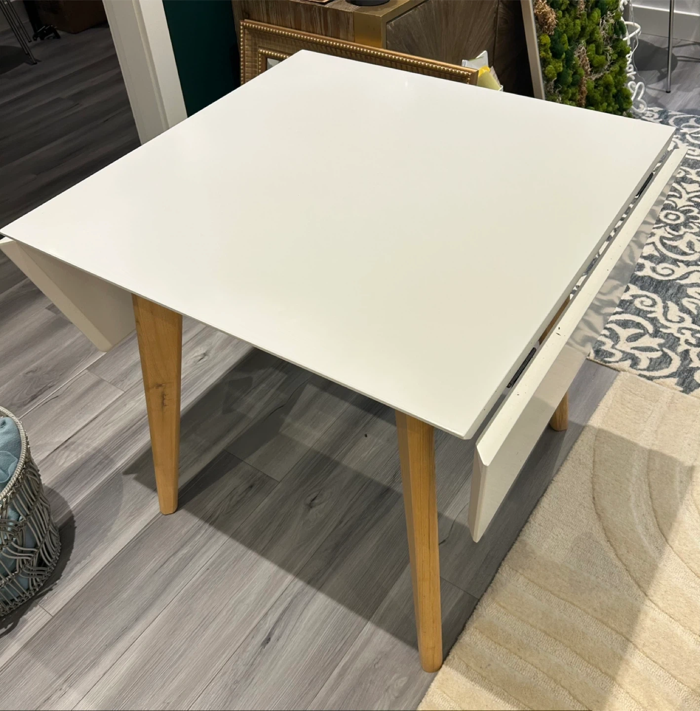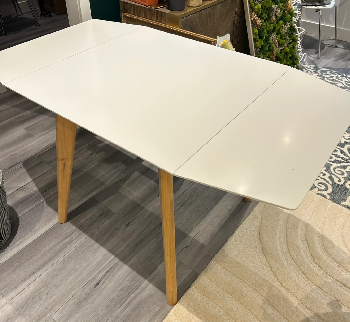 Selling a lovely white extendable dining table! It's in great condition and perfect for small spaces that need a little extra room for guests. The light wood legs give it a modern, airy feel. It's super easy to extend and retract, making it a practical choice for any home. 54 inches when extended and 31 inches when collapsed.