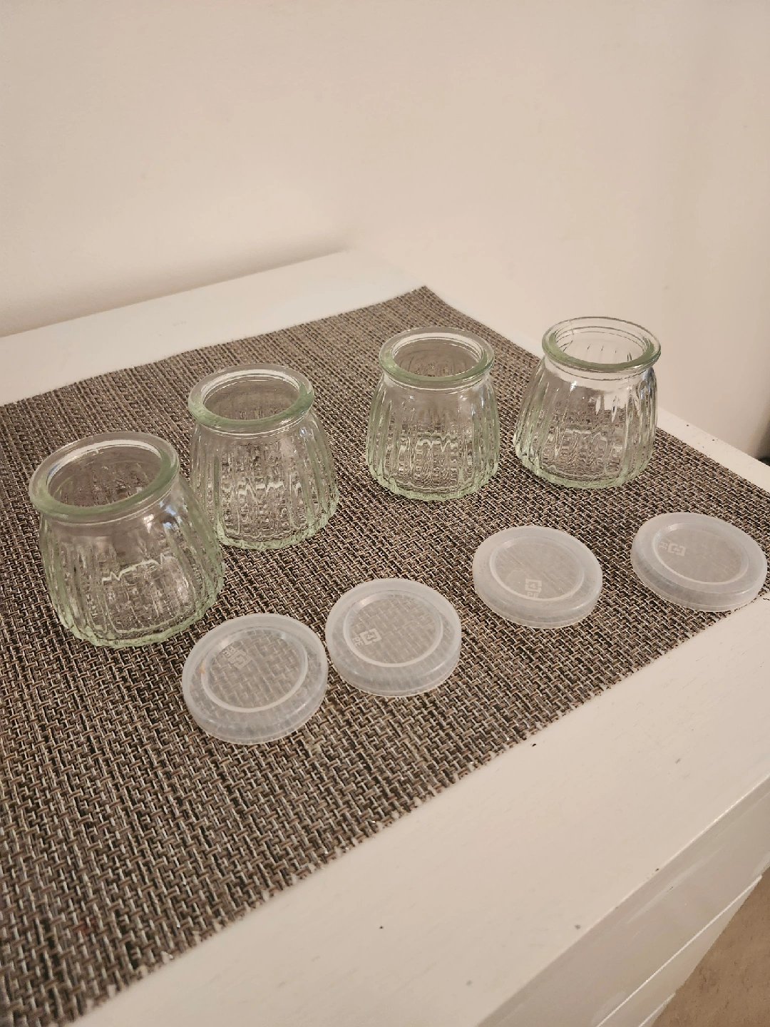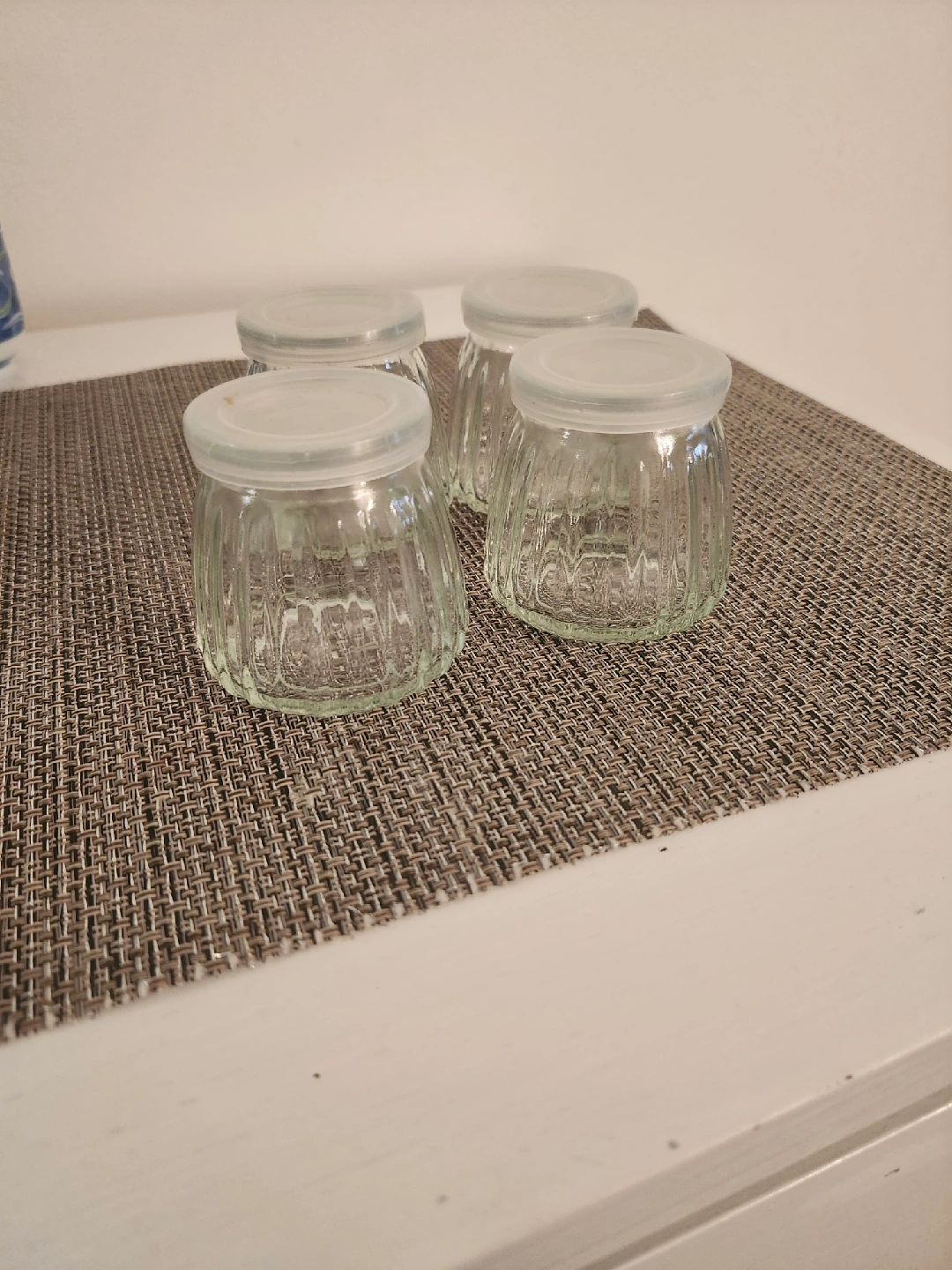 316Four glass jars with lids, perfect for desserts or small servings! They're in great condition and ready for a new home