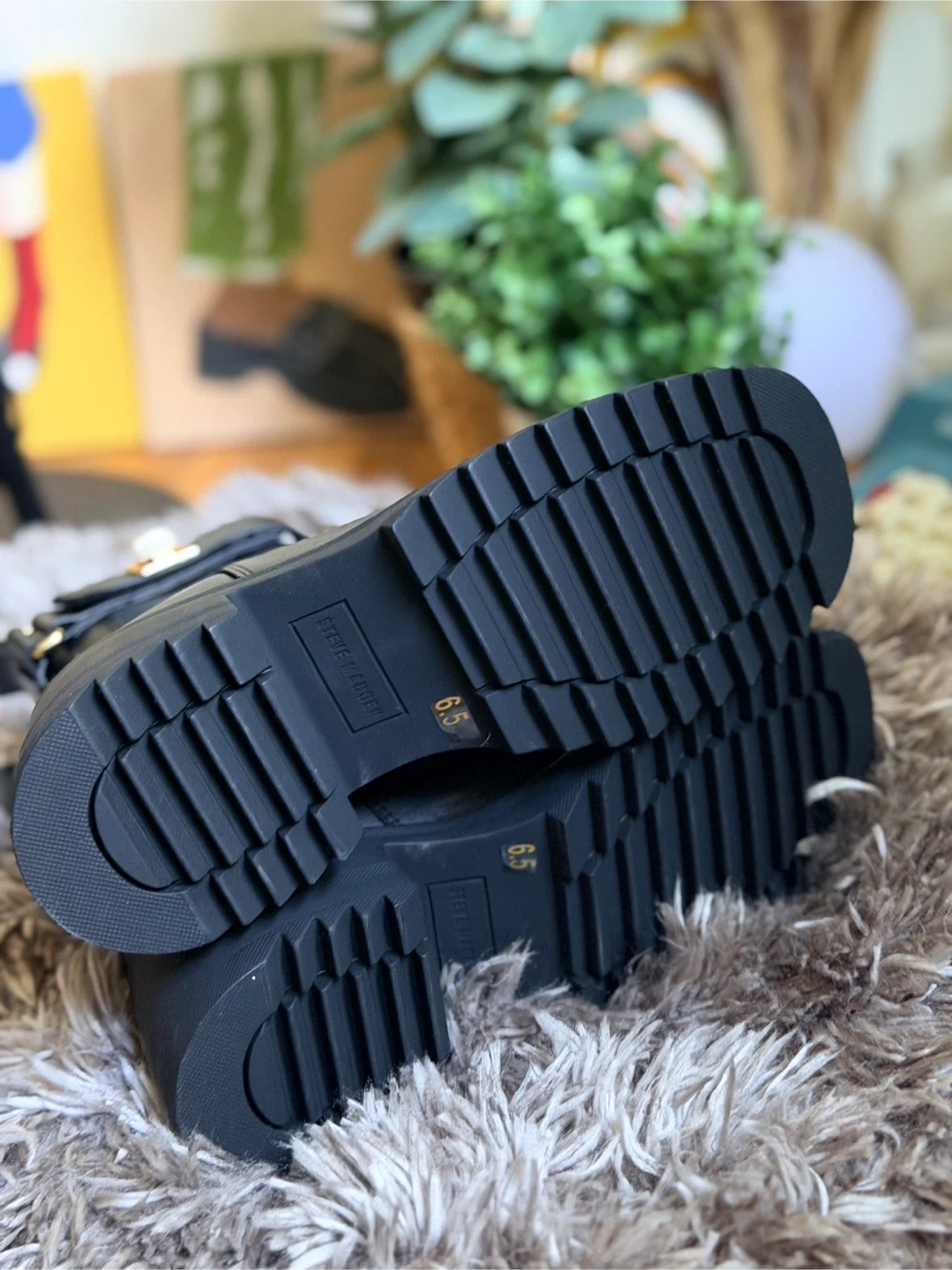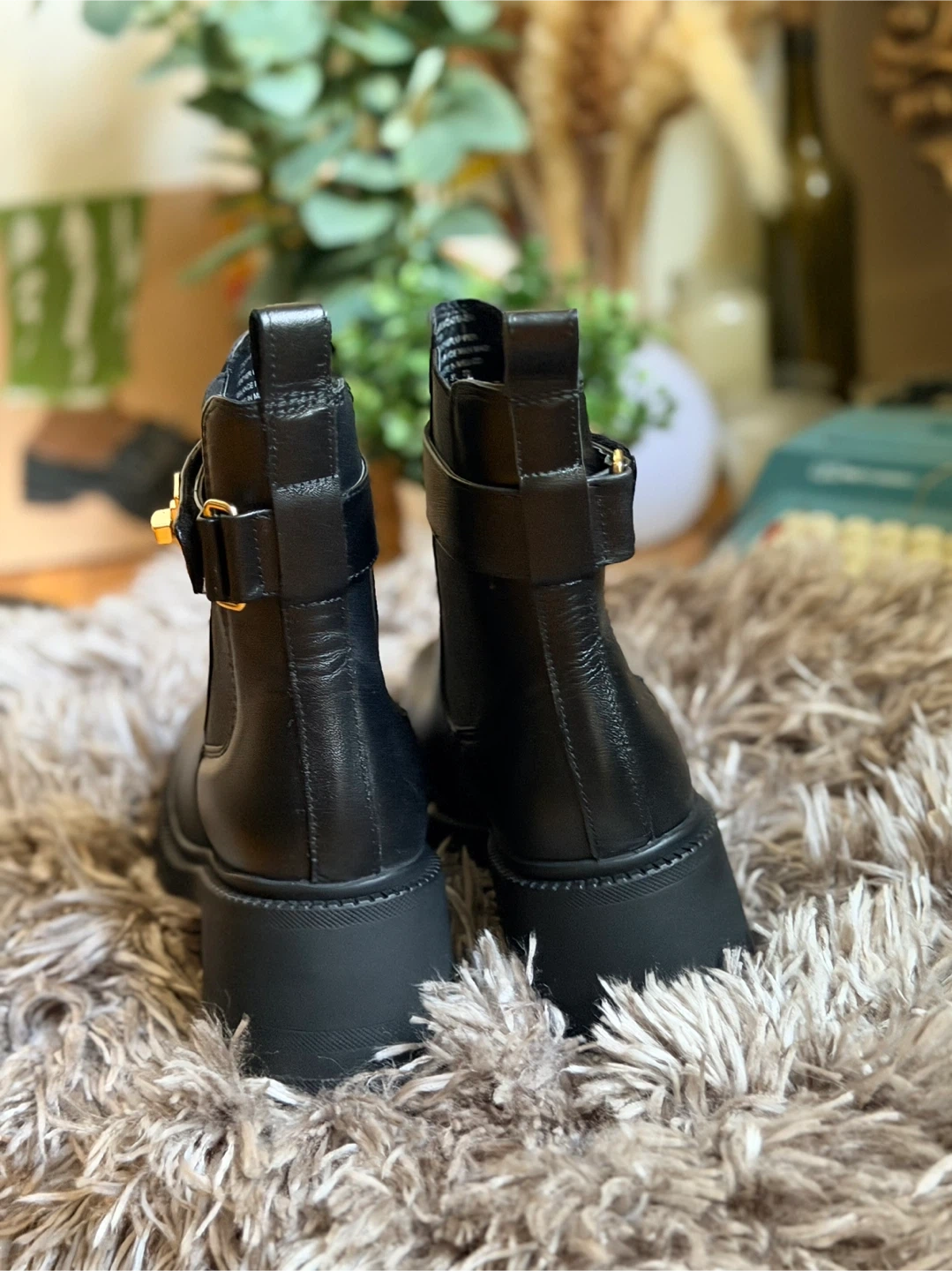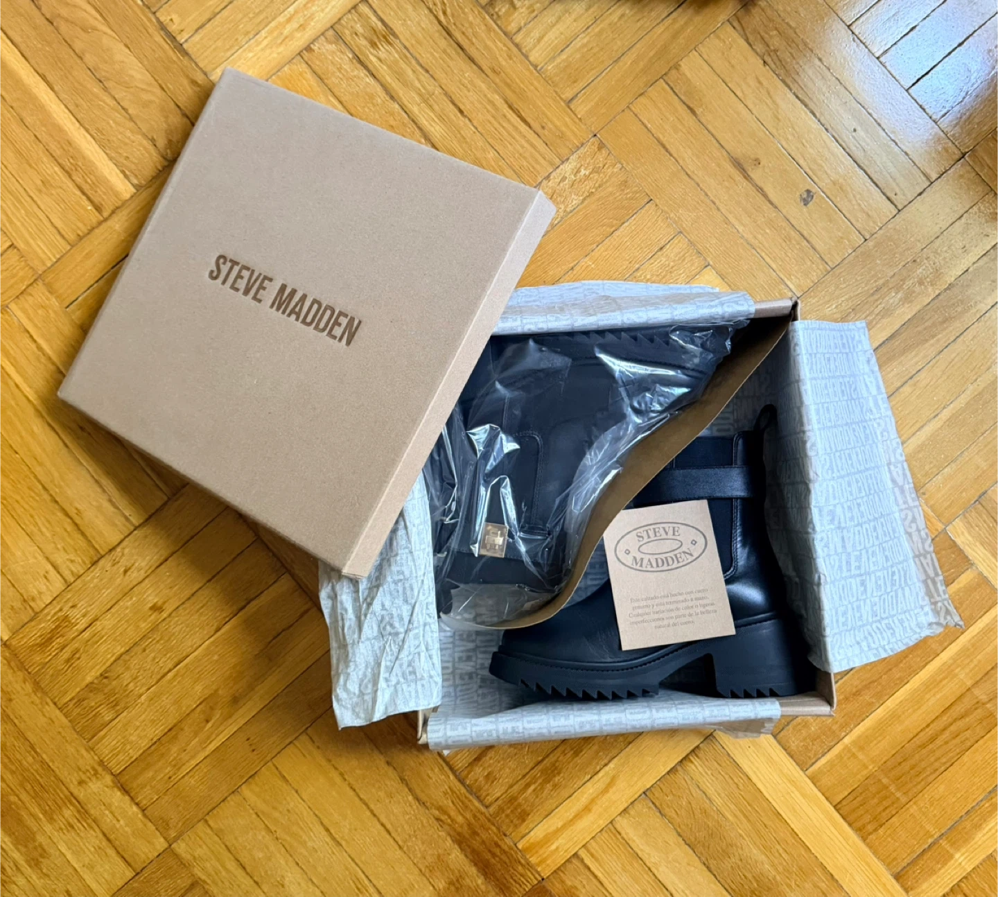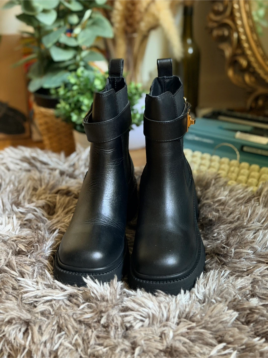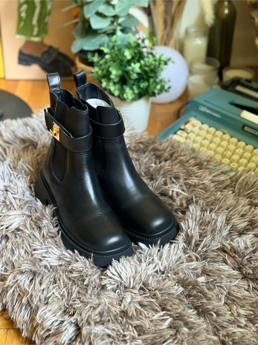 These are a pair of Steve Madden black leather ankle boots in size US 6.5. They feature a chunky lug sole and a buckle detail. Perfect for adding a bit of edge to your outfit!