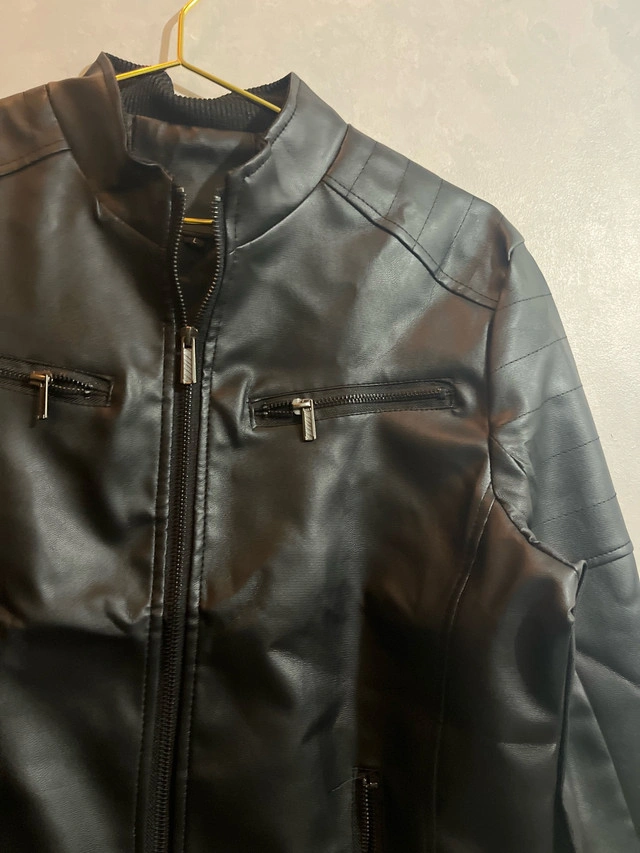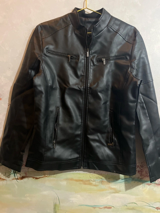 102This brand new stylish black faux leather jacket is brand new, perfect for adding an edgy touch to any outfit. Featuring a sleek design with zip details, it's both fashionable and functional. * Material: Faux Leather * Colour: Black * Closure: Zipper * Pockets: Multiple front pockets with zippers We have 2 in stock! Both size large! Pick up is in Brampton near Sheridan College.