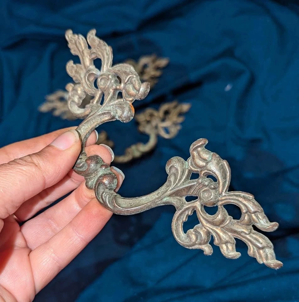 Elegant and highly detailed solid brass drawer pulls featuring openwork leaf and scroll motifs in the Baroque Rococo Revival style. Each handle is beautifully cast with deep relief and graceful curves, showing aged patina and light verdigris in crevices.