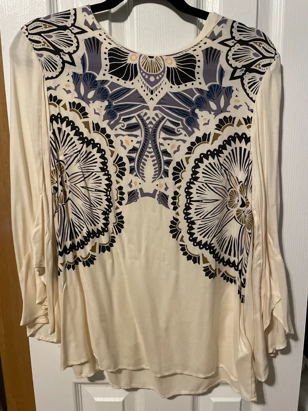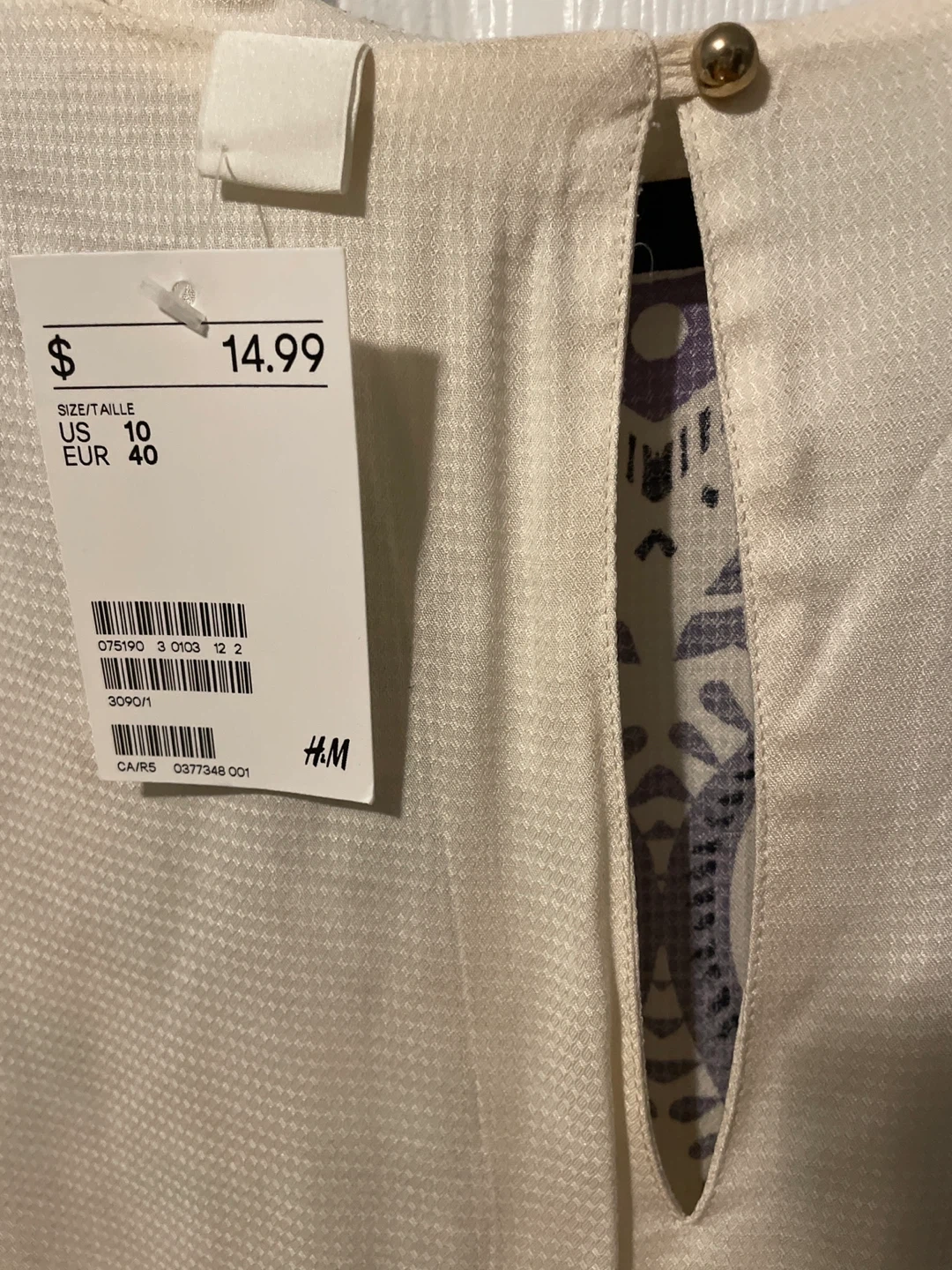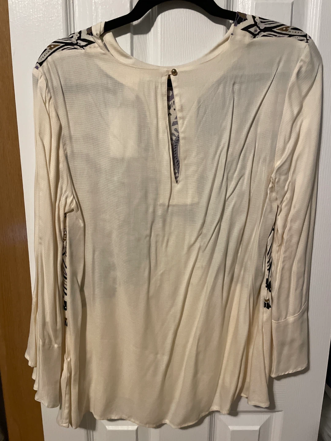 Selling a lovely cream-coloured blouse from H&M! It's a size US 10 / EUR 40. The blouse features a unique pattern on the back and 3/4 flutter sleeves. Originally bought for $14.99!