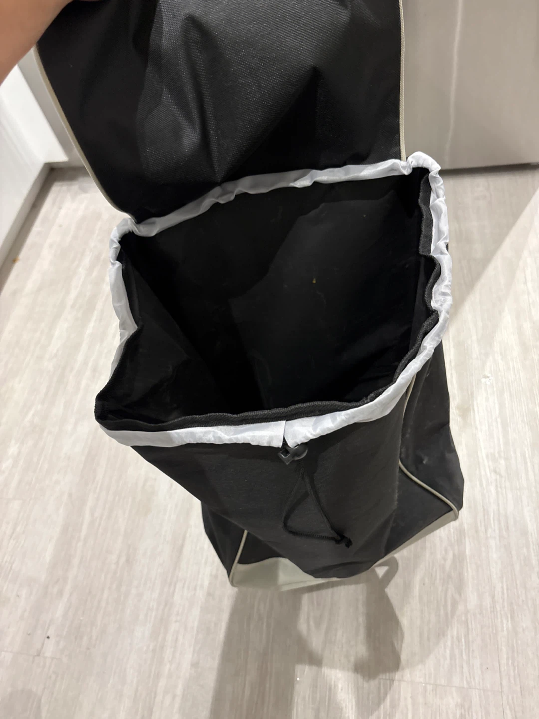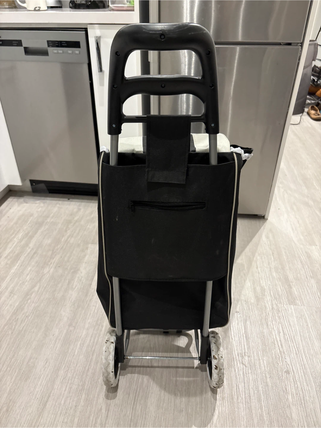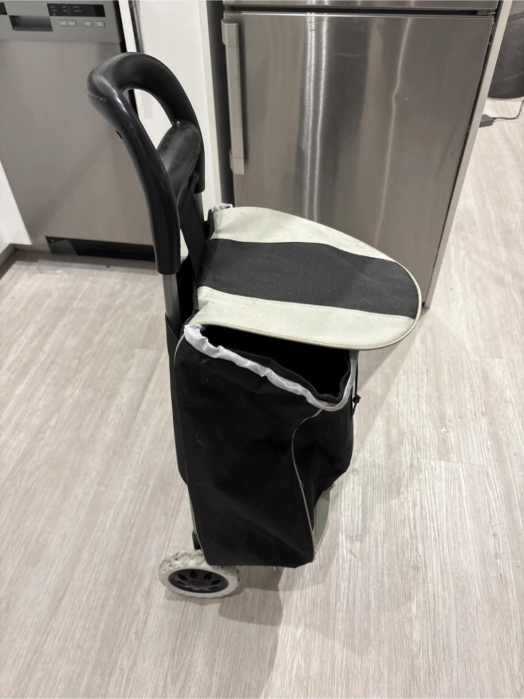 Selling a handy rolling shopping cart! It's black and perfect for groceries or trips to the market. It has a sturdy handle and wheels to make carrying heavy loads easier