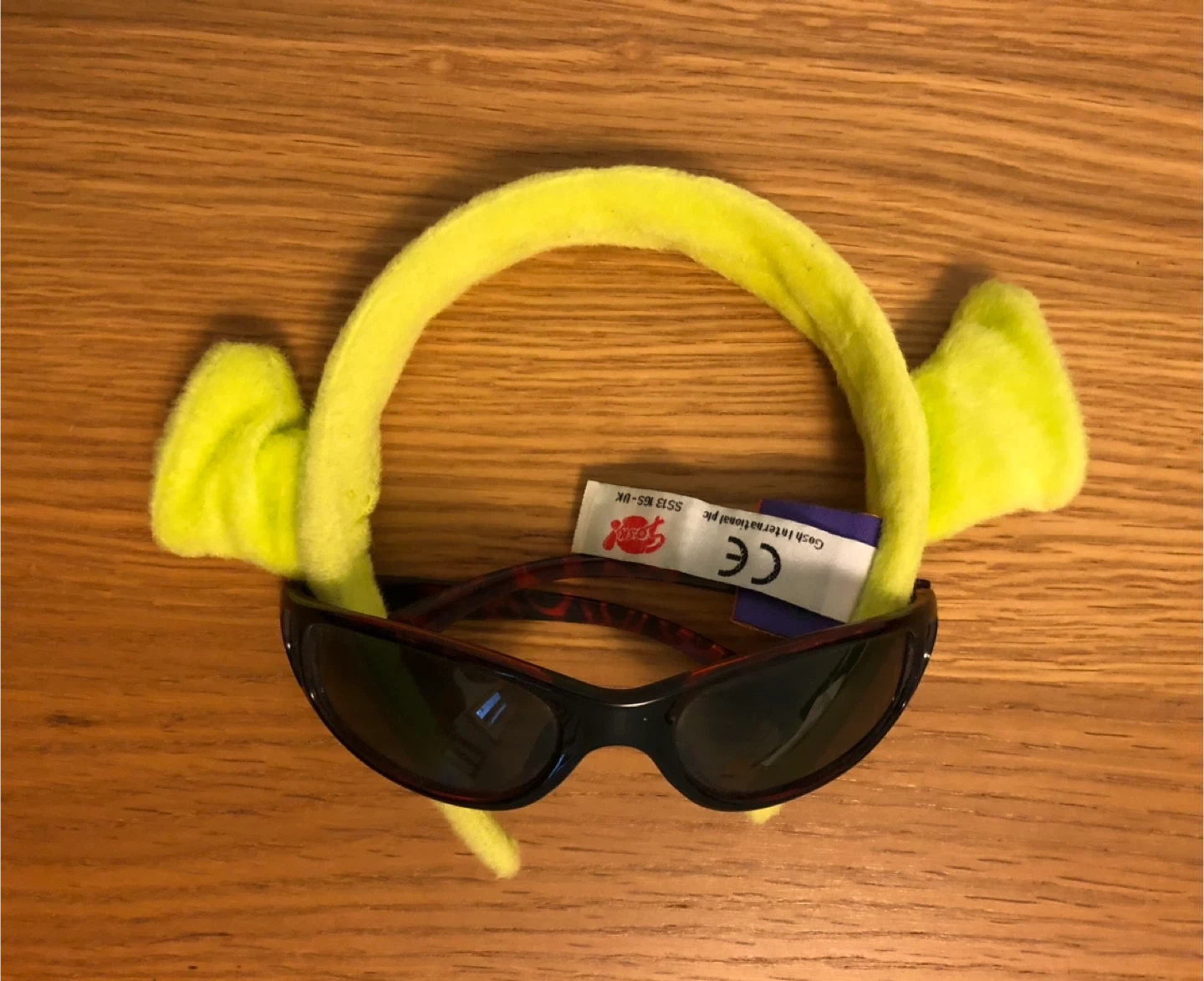 ๐ a fun Shrek the Third headband and a pair of sunglasses! Perfect for a costume or just for fun. The headband is bright yellow and fuzzy, and the sunglasses have a cool tortoiseshell pattern on the frames