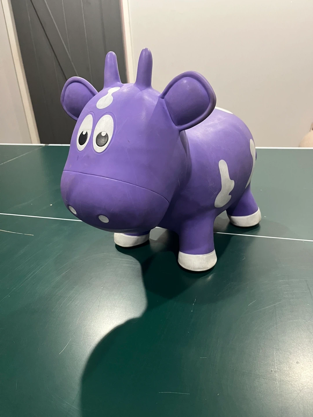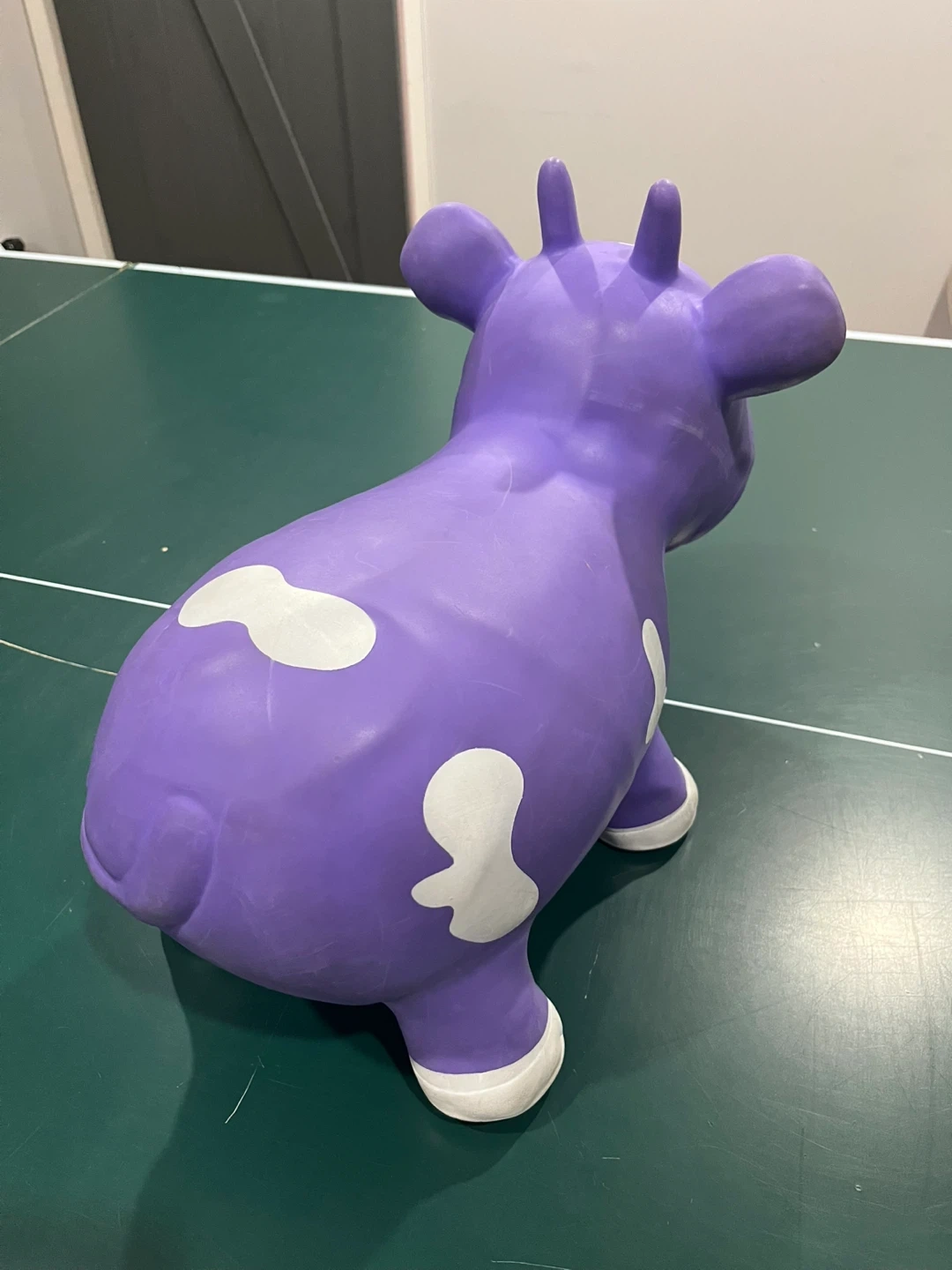 A fun purple inflatable bouncy cow toy with white spots. It's made of durable material for active play. This toy is great for kids who love to bounce and play indoors or outdoors!