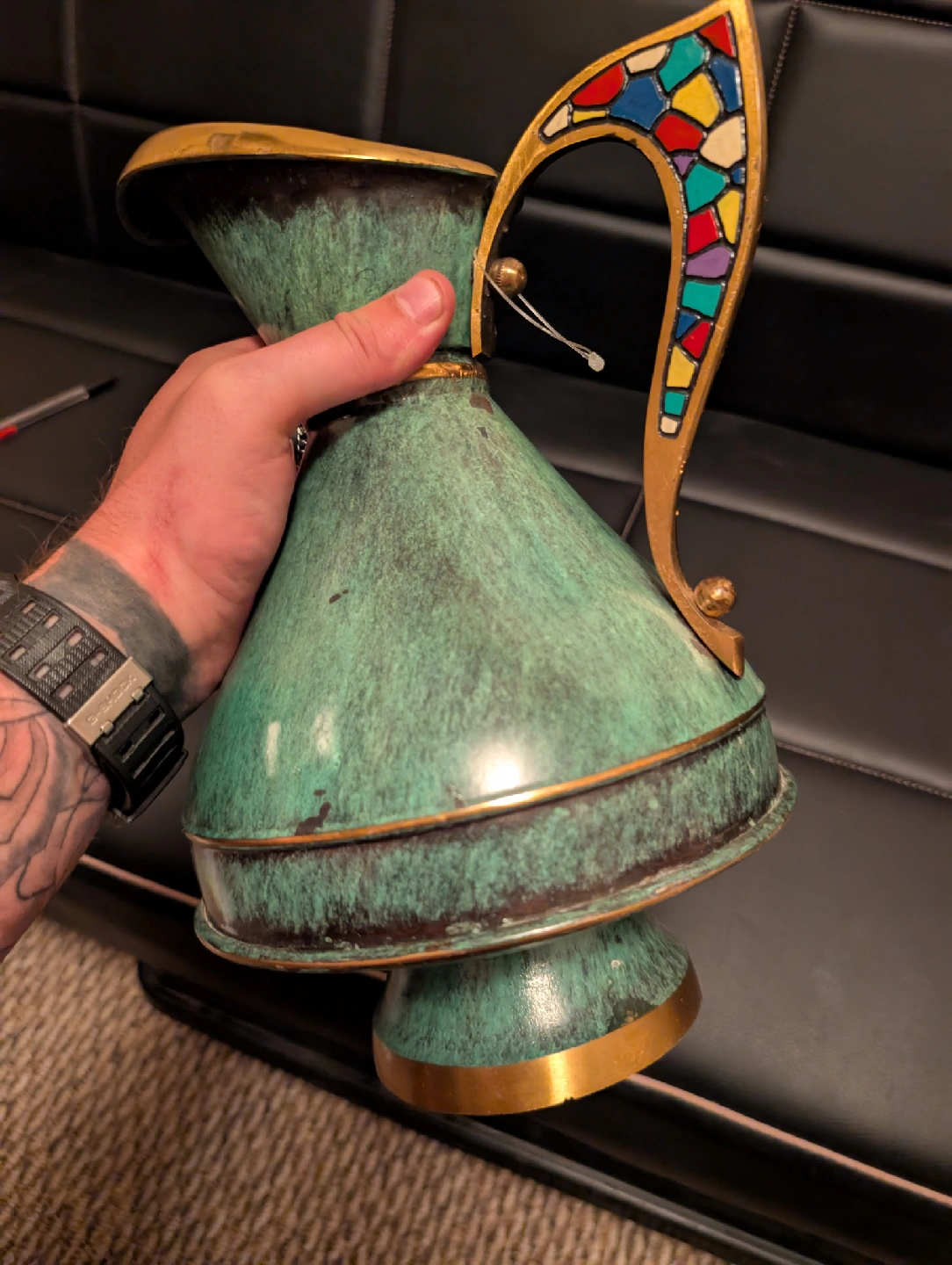 Vintage dayagi verdigris green brass pitcher made in Israel beautiful looking pitcher with lots of character and style to it great for any place for everyday use or special occasions I'd say it's a larger medium size pitcher but it's not to big it 185$ or best offer price negotiable