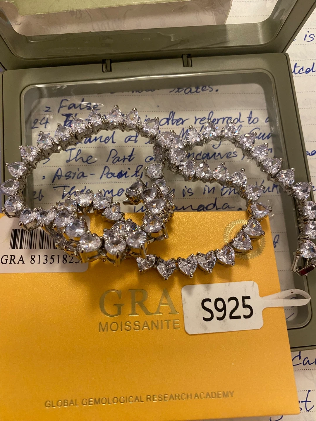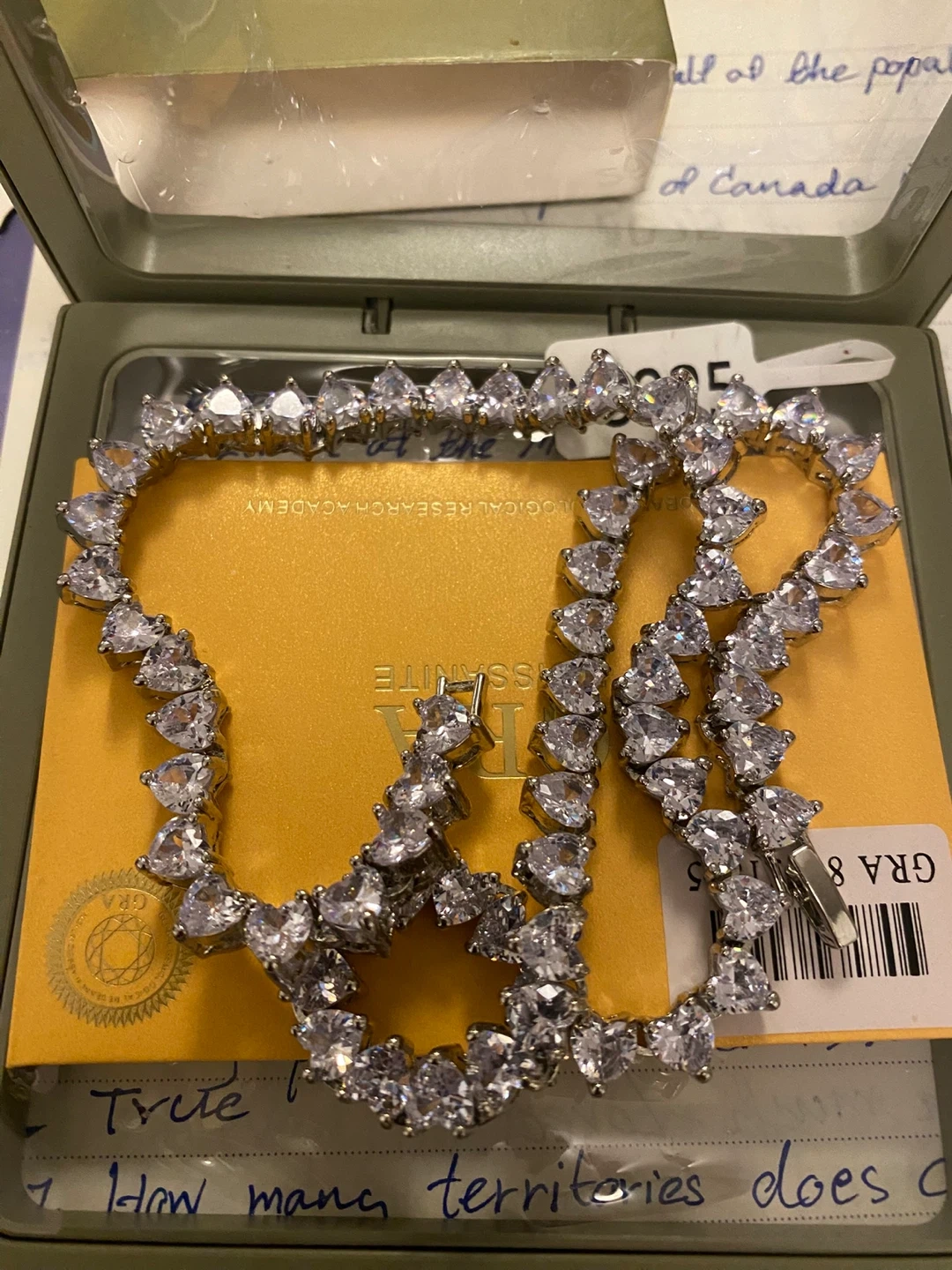 Selling a GRA Moissanite tennis necklace. It's marked S925, so it's made of sterling silver. Comes in a box.