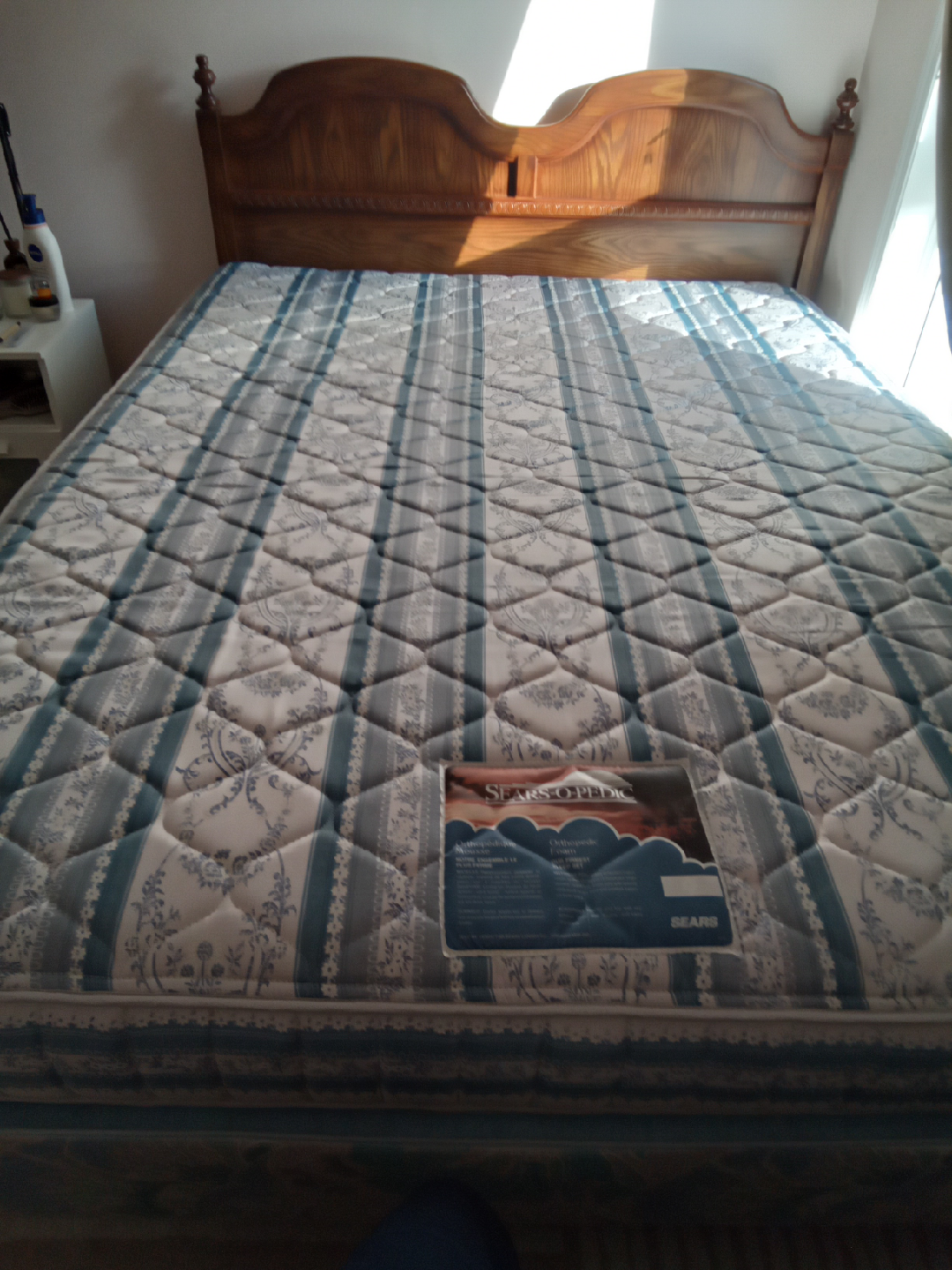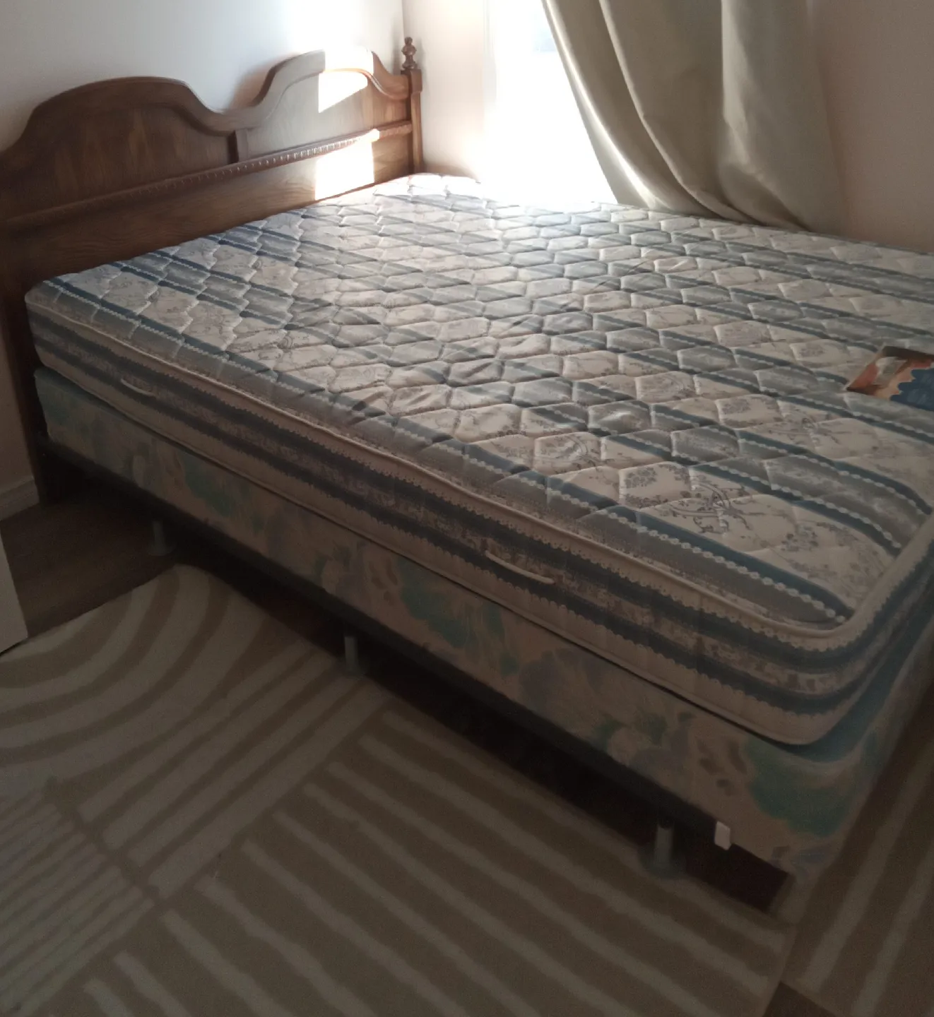 I sell a set consists of a quen sized metal bed frame with a wooden curved headboard and mattress. There are minor scratches on the board. The mattress is in a good condition without spots and has a massage option built-in.