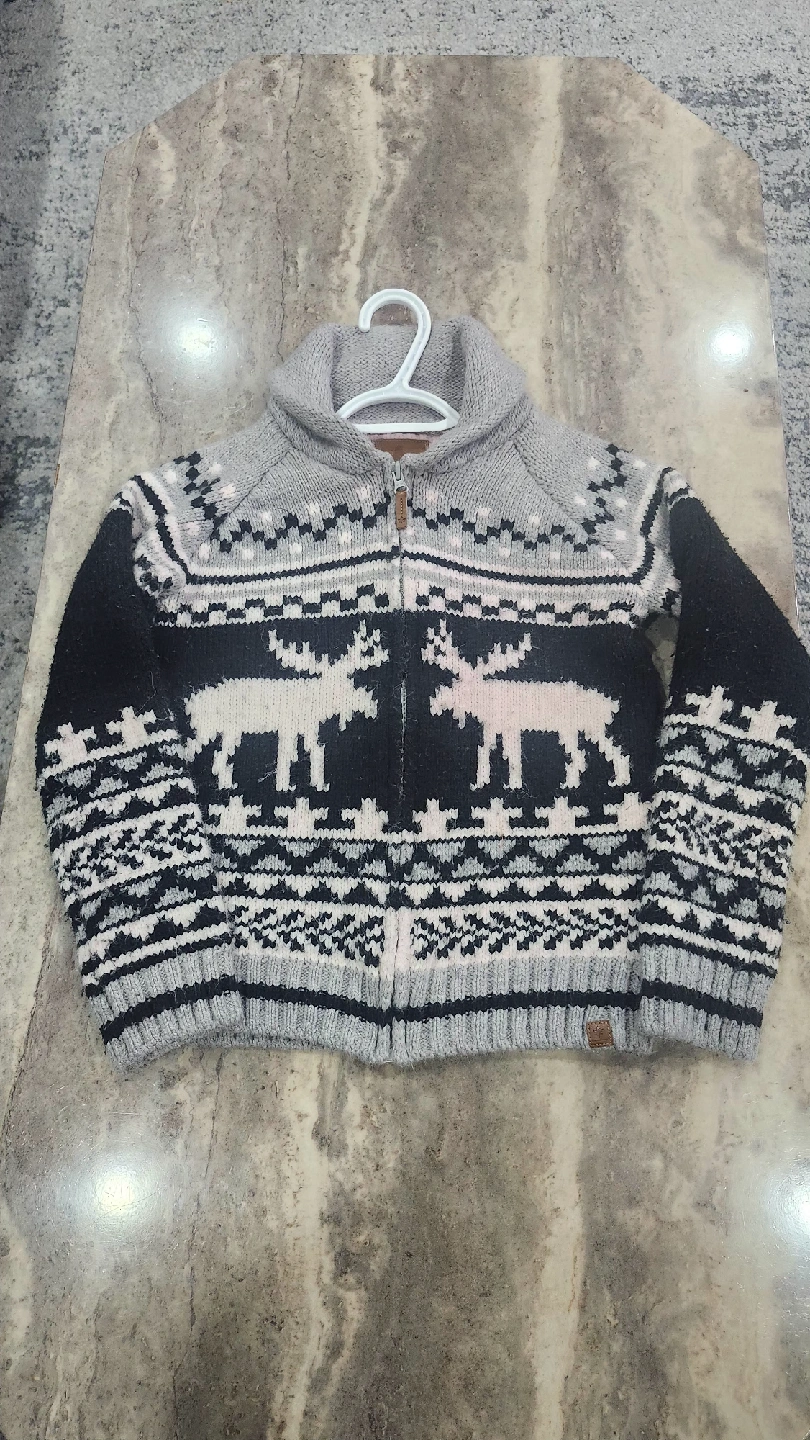 1000+Cozy and extremely warm Canadiana brand full zip sweater featuring a charming moose pattern! It's a blend of grey, black, and white, pink hue inside, perfect for staying warm during chilly Canadian evenings. The sweater has a comfortable collar and a full zip closure, making it easy to layer. A classic Canadian look!