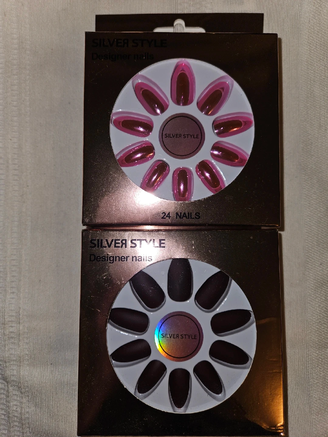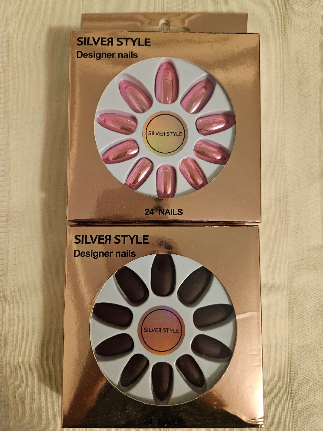 Selling two boxes of Silver Style Designer Nails. One box has pink nails, and the other has matte brown nails. Each box contains 24 nails