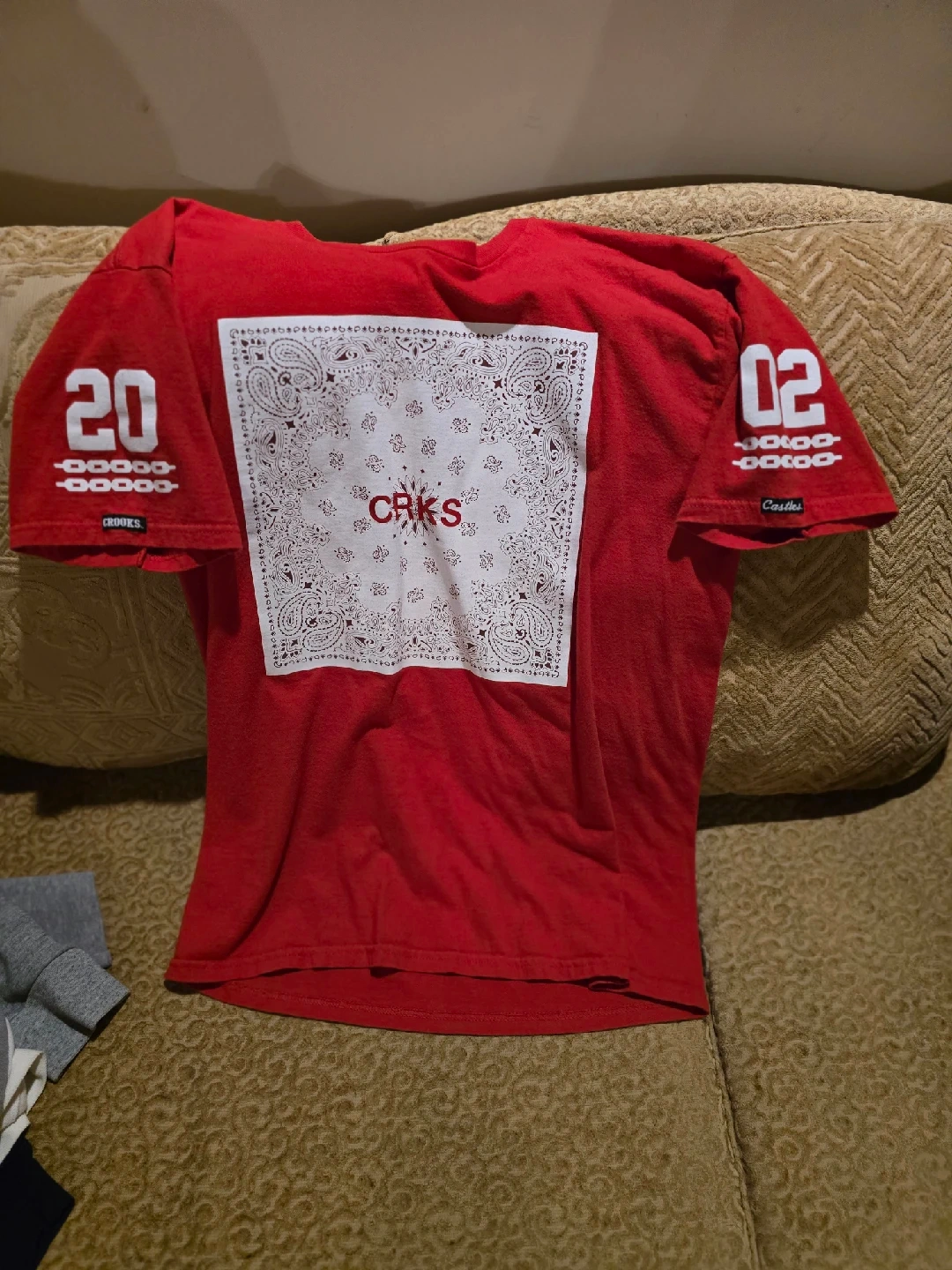 Selling a Crooks & Castles red t-shirt in size large! It's made of 100% cotton and has a cool design on the front and sleeves. Perfect for casual wear!