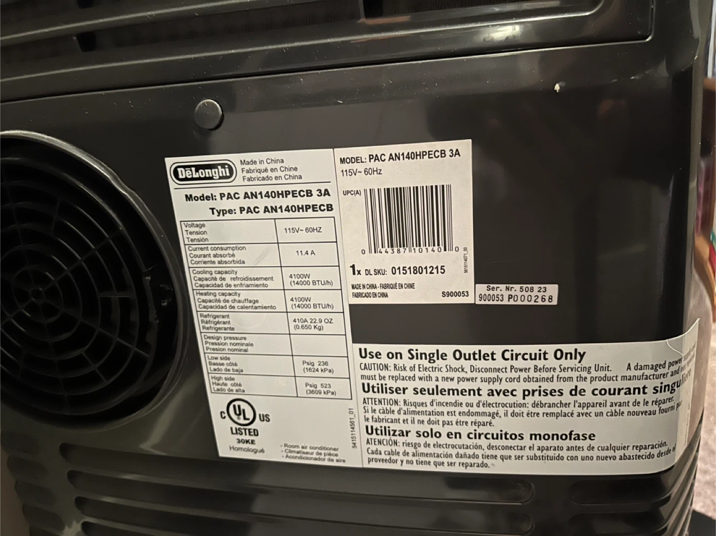 108DeLonghi Pinguino portable AC. Includes original components and accessories as shown in pictures. 115V 60Hz 11.4 Amp (don’t run anything else on the same standard circuit!) 14,000 btu cooling OR heating. very effective, blasts cold air & cools a room FAST unlike cheaper models. Model PAC AN140HPECB 3A Paid $550 3 yrs ago, moving to a house with central AC.