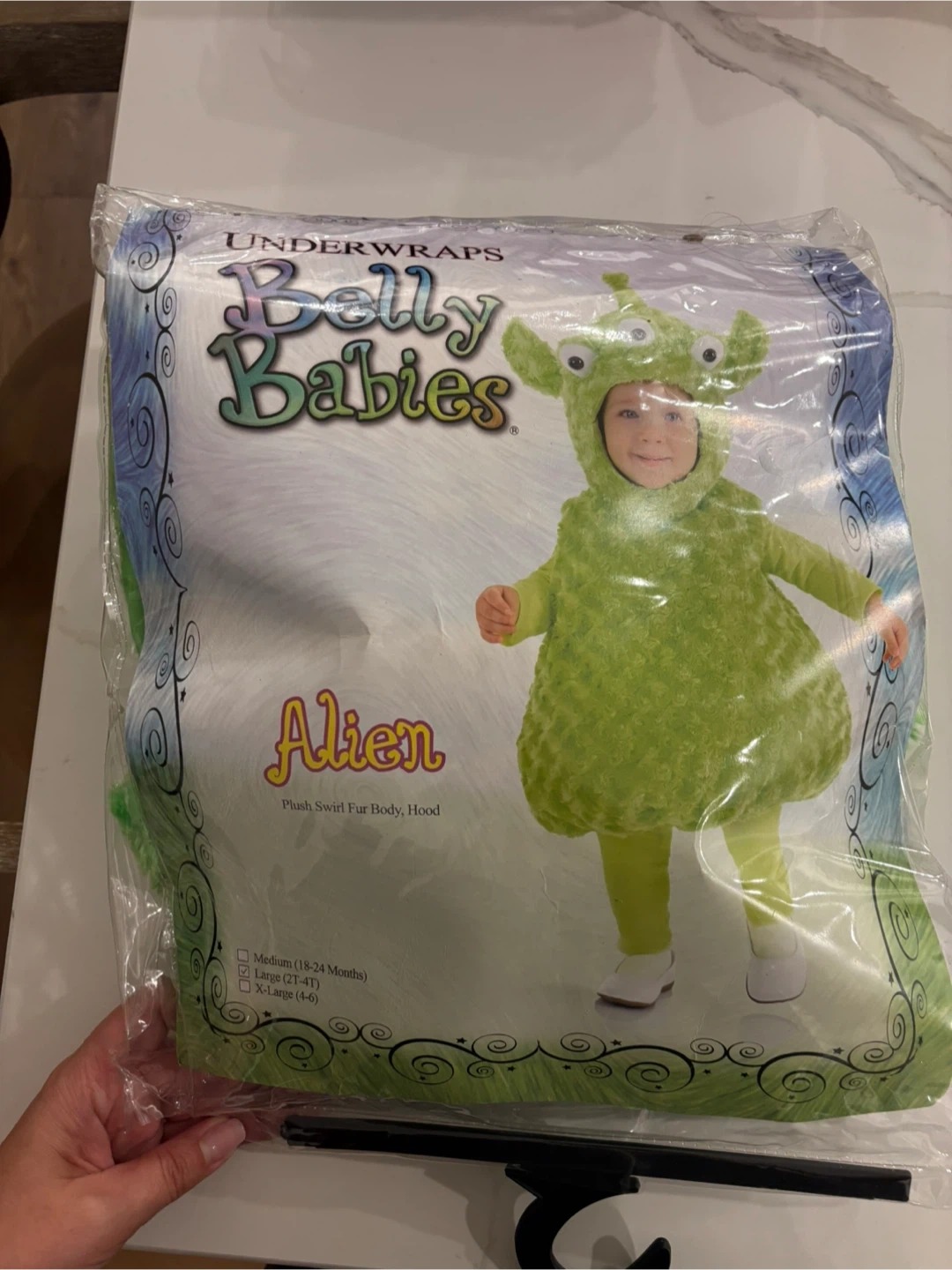 10Selling a Belly Babies Alien costume! It's a plush swirl fur body with a hood. The size is Large, which fits 2T-4T.