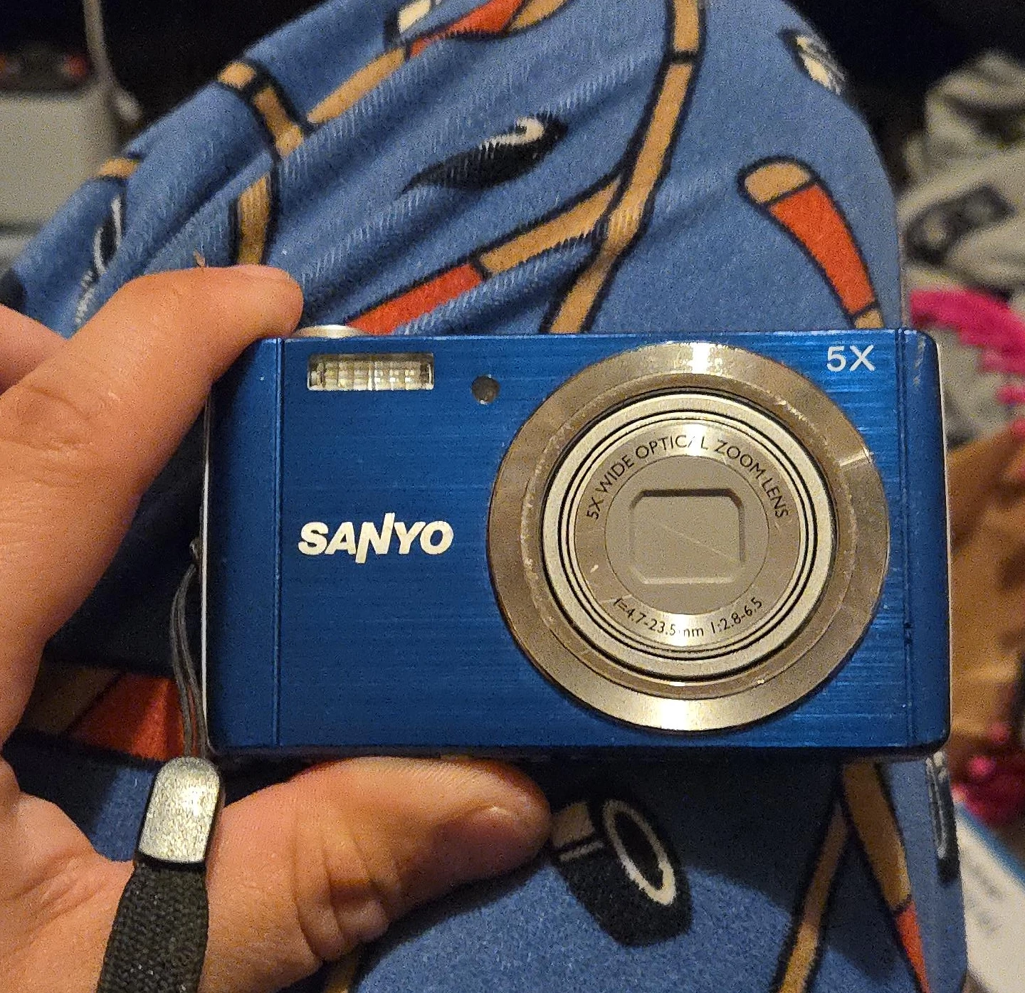 Selling a Sanyo camera with a 5X wide optical zoom lens. It's a nice blue colour and seems to be in good condition. Great for taking photos on the go!