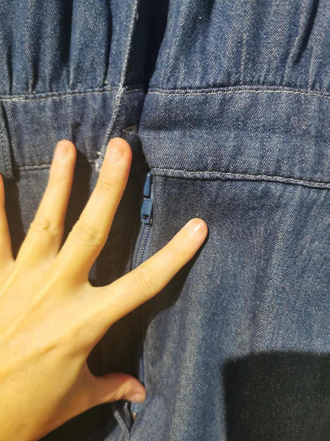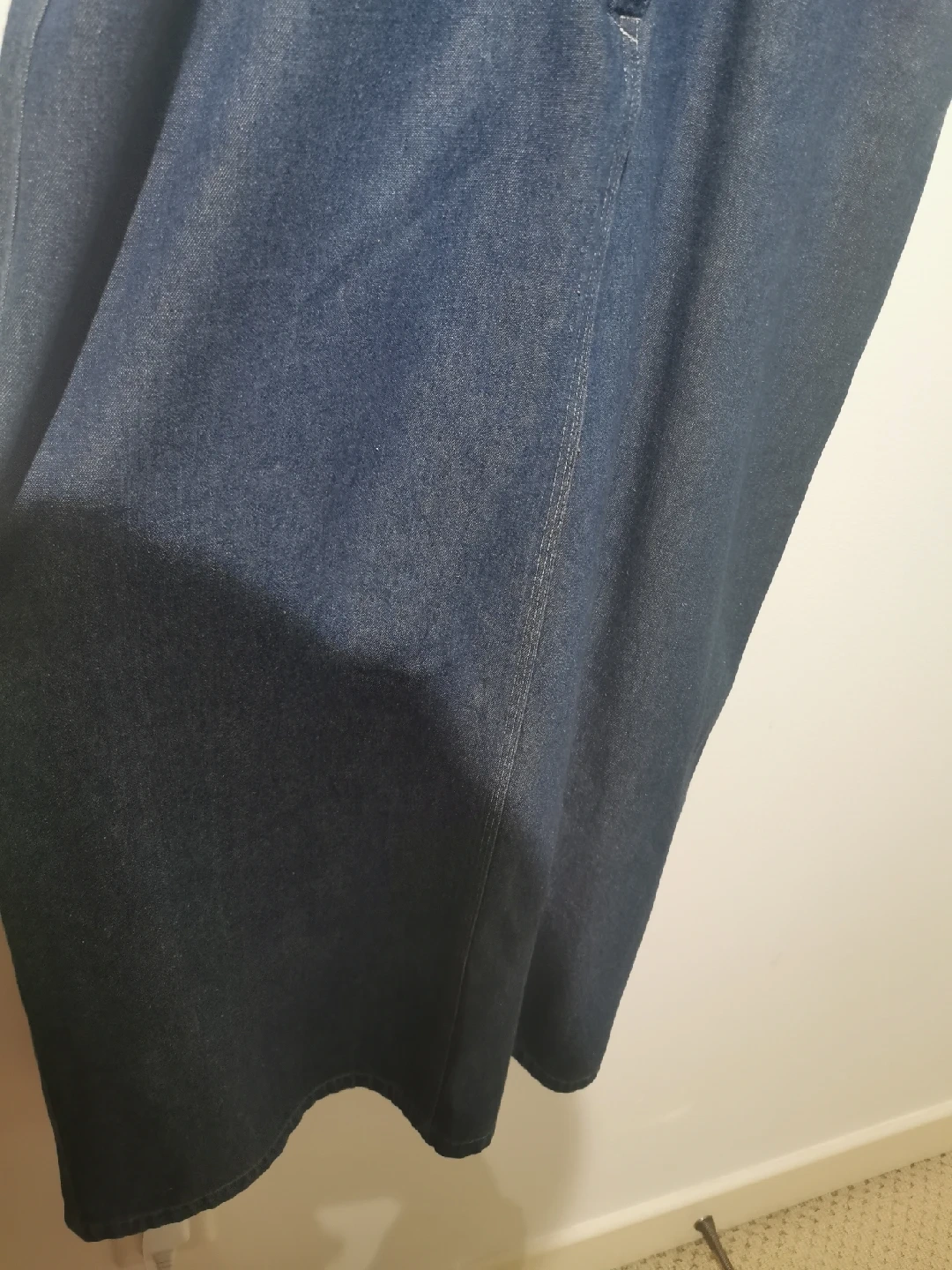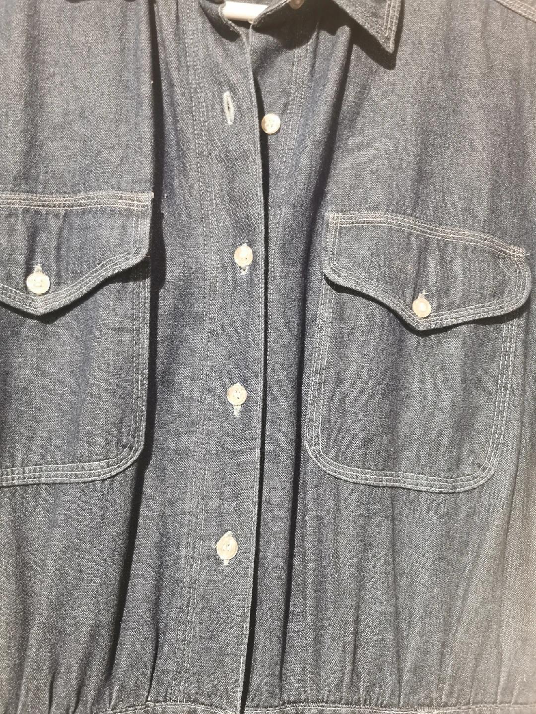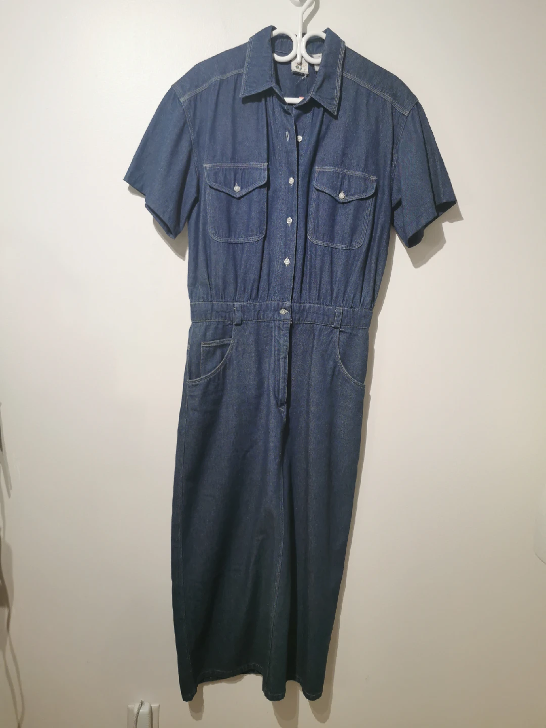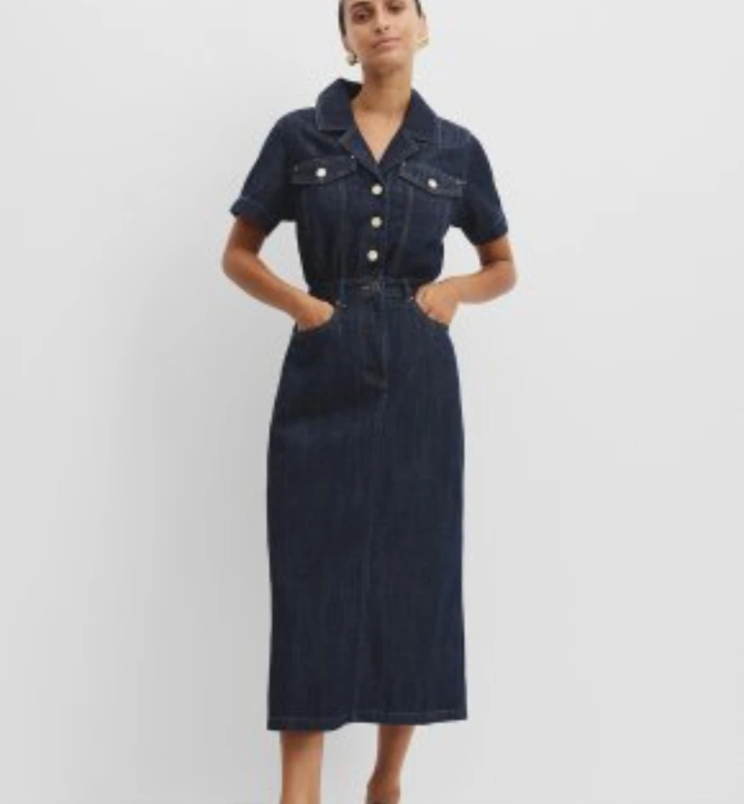 A cute denim dress with short sleeves. It has a button-up front and pockets on the chest and hips. Perfect for a casual day out!