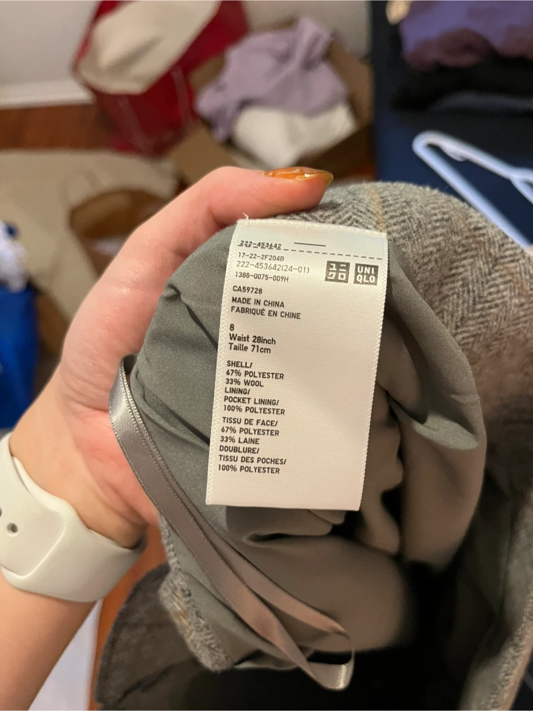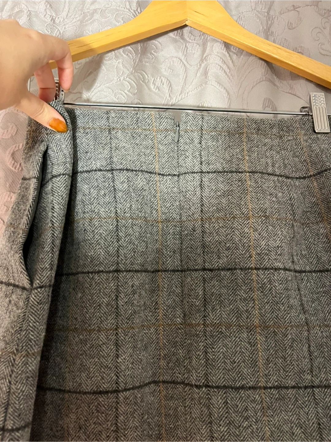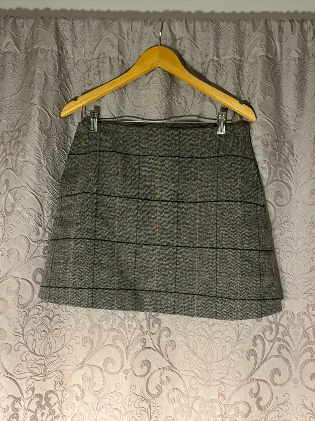 36Selling a cute Uniqlo mini skirt! It's a size 6 with a 28-inch waist (71cm). The skirt has a classic plaid pattern in grey tones. The shell is made of 67% polyester and 33% wool, while the lining is 100% polyester