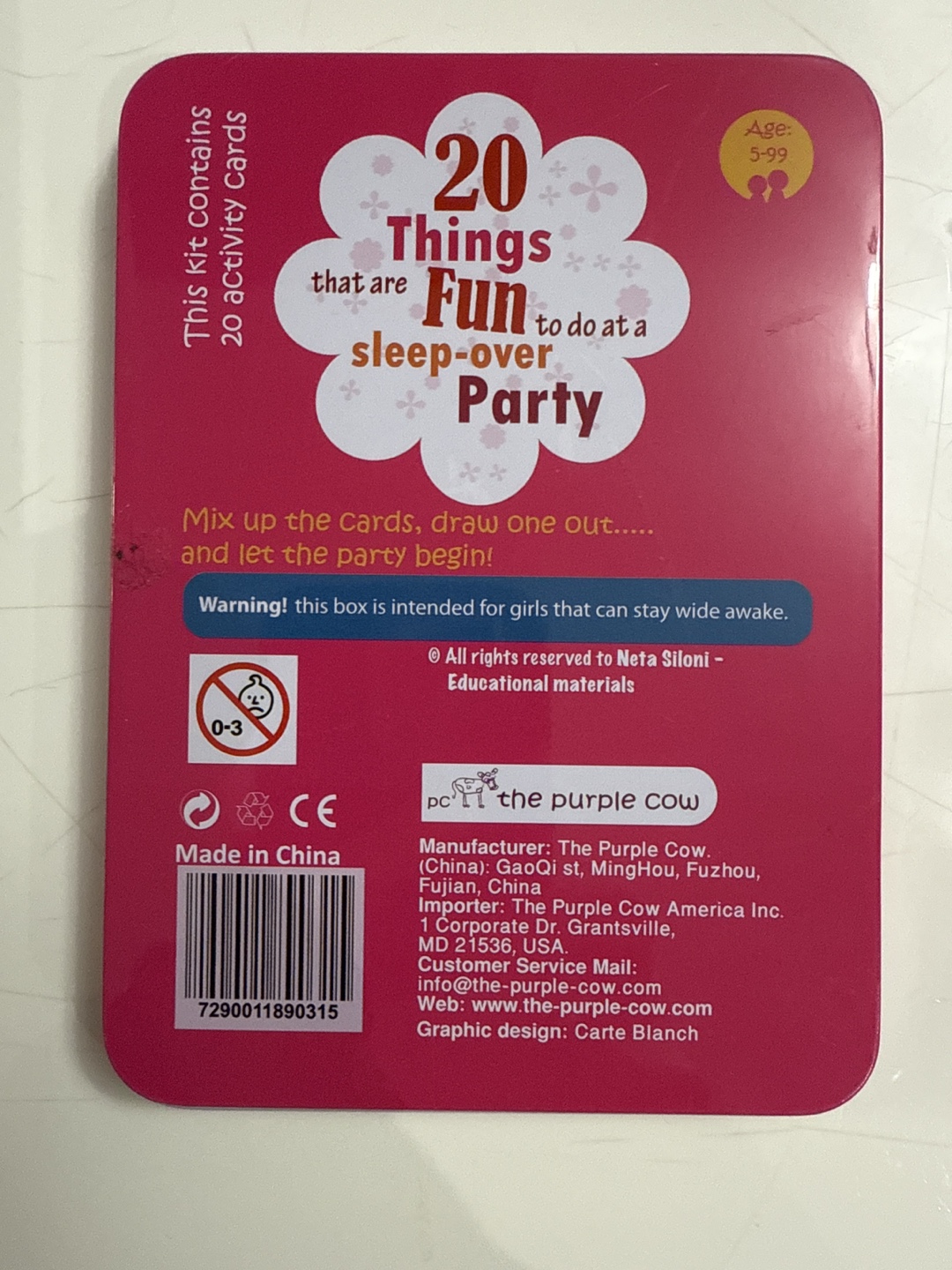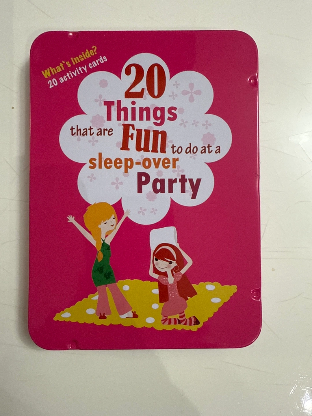 This is a set of activity cards from The Purple Cow, titled '20 Things that are Fun to do at a Sleep-over Party'! It contains 20 activity cards and is suitable for ages 5-99. It's perfect for adding some fun to any sleepover!