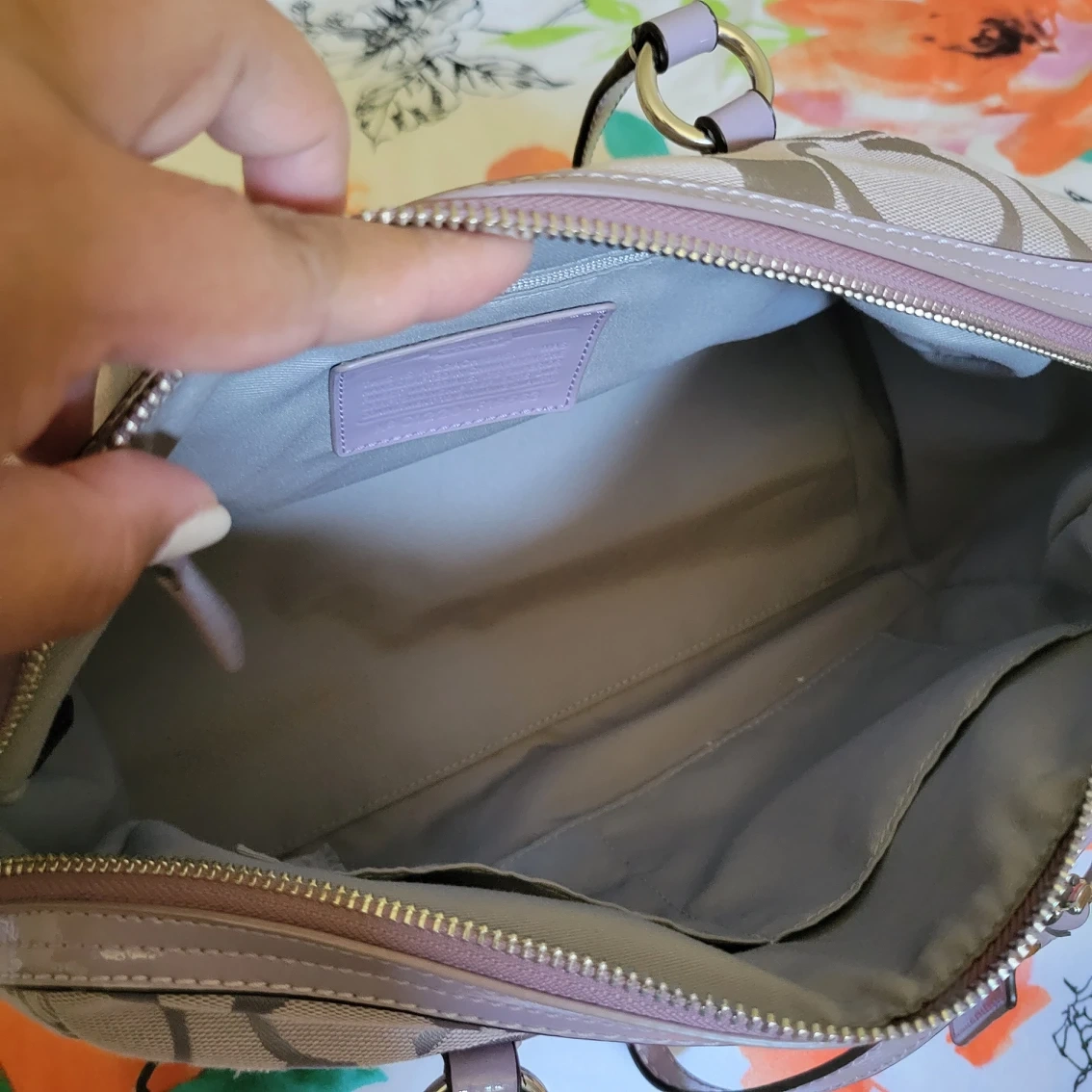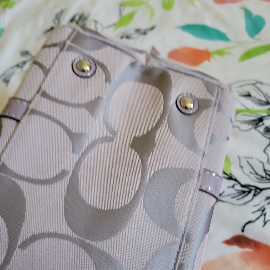 It looks new. It's a fabric canvas lightweight, easy to wear , and it fits the umbrella, water bottle, and your long wallet, no scratch/rubs, no tears, no awful smell, canvas color is lavender with silver material.