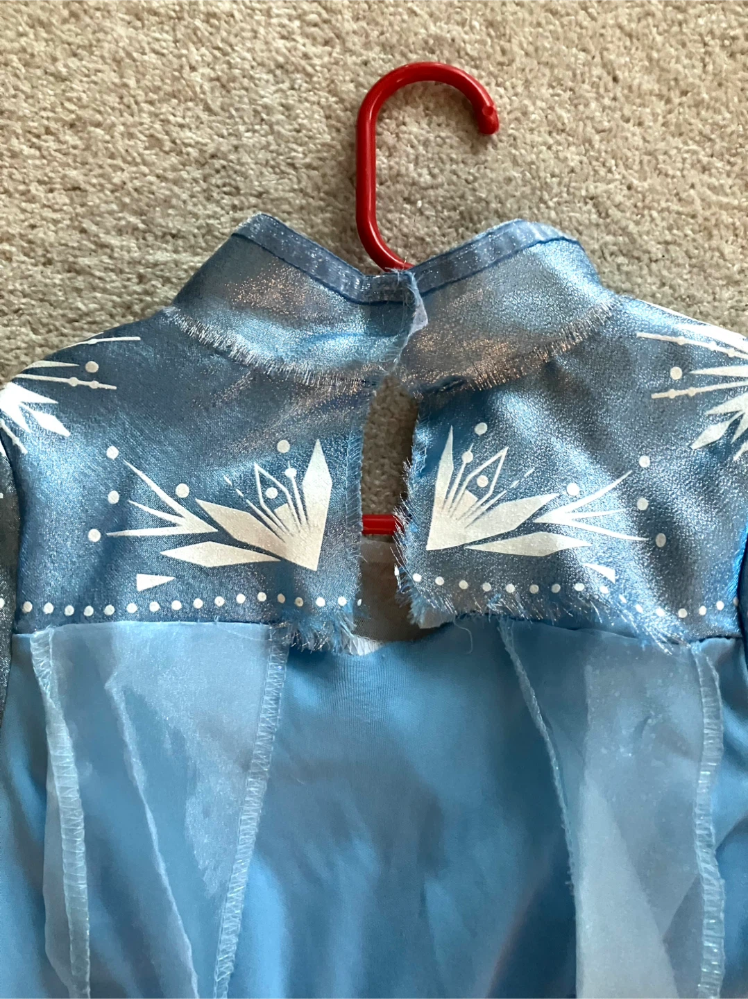 Disney Frozen Elsa costume. Has been well loved and is starting to come apart at the back (see photo). Will survive another Halloween and longer if you’re handy with repairs.