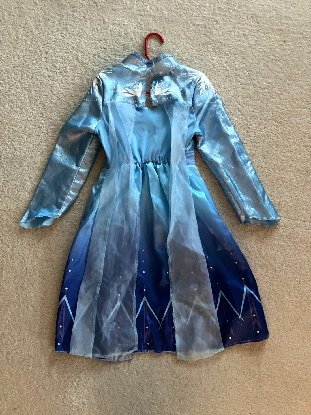 Disney Frozen Elsa costume. Has been well loved and is starting to come apart at the back (see photo). Will survive another Halloween and longer if you’re handy with repairs.