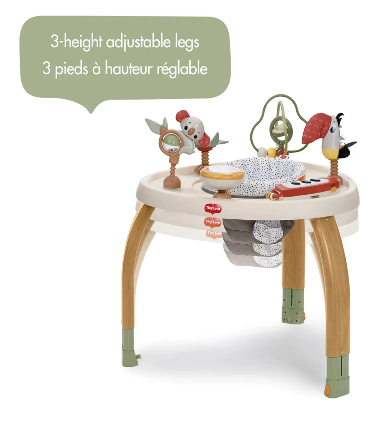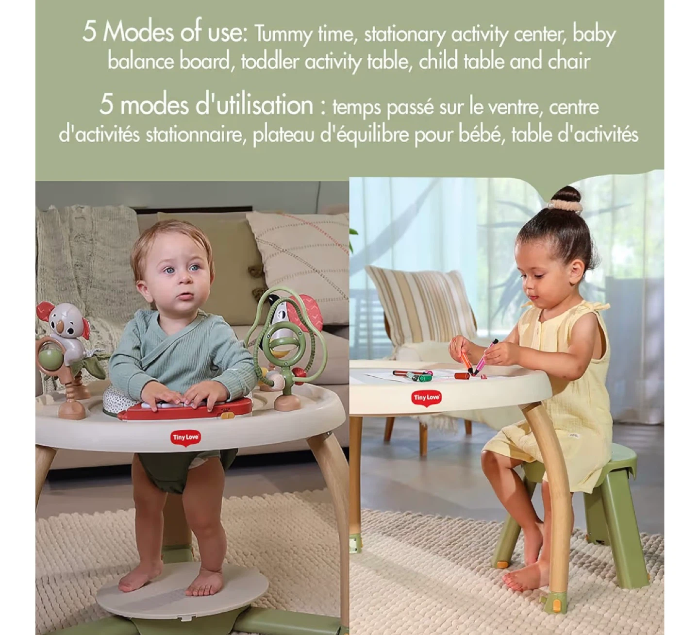 - 5 Modes of Use: Tummy time, stationary activity center, baby balance board, toddler activity table, child table and chair.