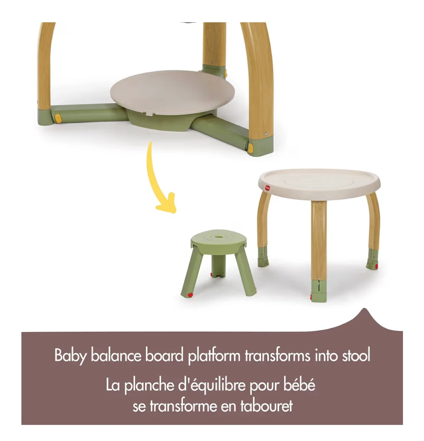 - Baby balance board platform transforms into stool, and with a table.
