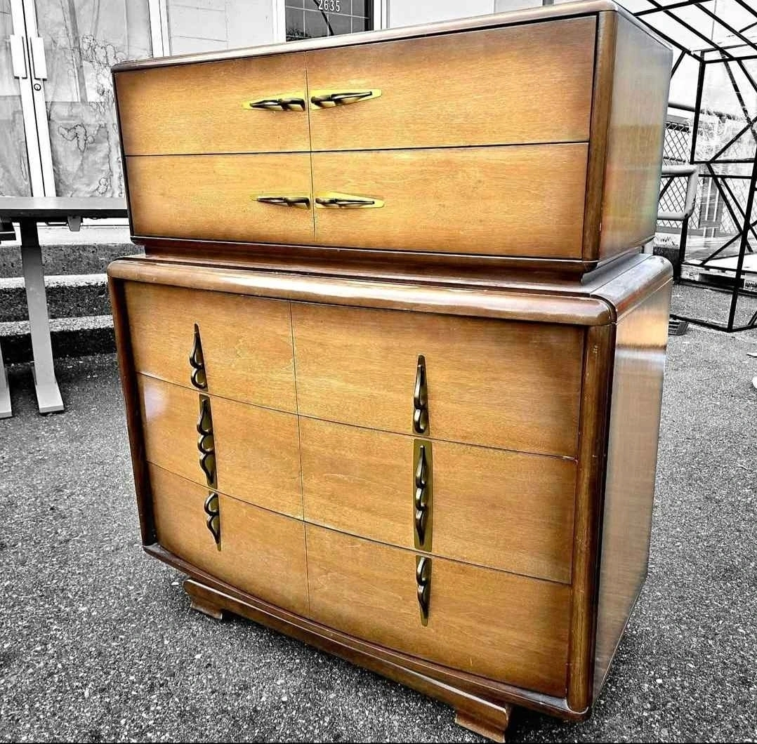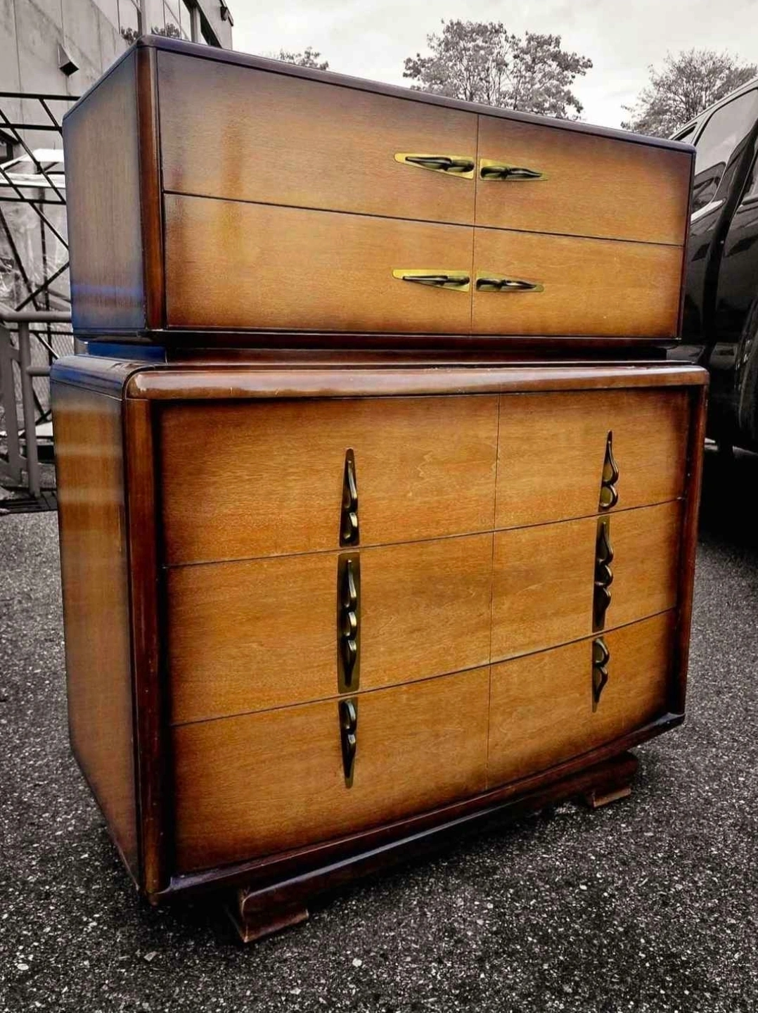 99Vintage mid century (1960s) curved tallboy dresser featured 5 drawers, original brass hardware and composed entirely of solid walnut. Dimensions: 36"(w) × 19"(d) × 48"(h) Pick up in downtown Vancouver or delivery may be arranged for a reasonable fee. Priority is given to those who are able to pick up. Follow us on Instagram to enjoy an exclusive discount on select furniture items: https://www.instagram.com/vanvaluevintage Tags: retro vintage antique burl wood rosewood walnut brass gold copper 1920s 1930s 1940s sideboard credenza buffet server Hutch cabinet tv bench hallway table console table entertainment unit living room dining room mcm mid century modern furniture retro vintage vinyl teak 1950s 1960s 1970s sixties tall boy tallboy cb2 eq3 west elm rental staging film tv Bedroom chest of drawers dresser rental