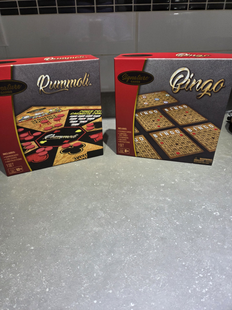 Selling a set of New Signature Games Rummoli and Bingo! The Rummoli set includes a gameboard, 105 chips, and instructions. The Bingo set includes 18 bingo cards, a master sheet, 75 markers, 300 chips, and instructions. Great for family game nights!