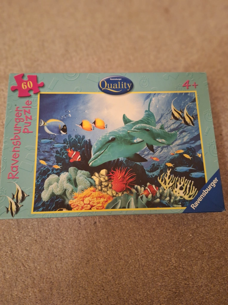 Looking to sell a Ravensburger puzzle with all 60 pieces in excellent condition. The puzzle depicts a colourful underwater scene with dolphins and various fish. Recommended for ages 4 and up!