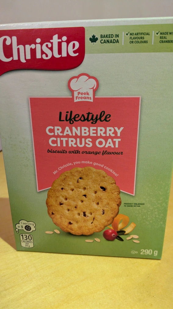 Selling a box of Christie Lifestyle Cranberry Citrus Oat biscuits with orange flavour! Baked in Canada with no artificial flavours or colours. Mr. Christie, you make good cookies!