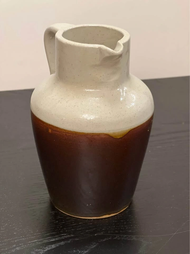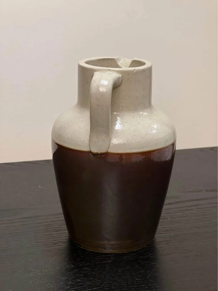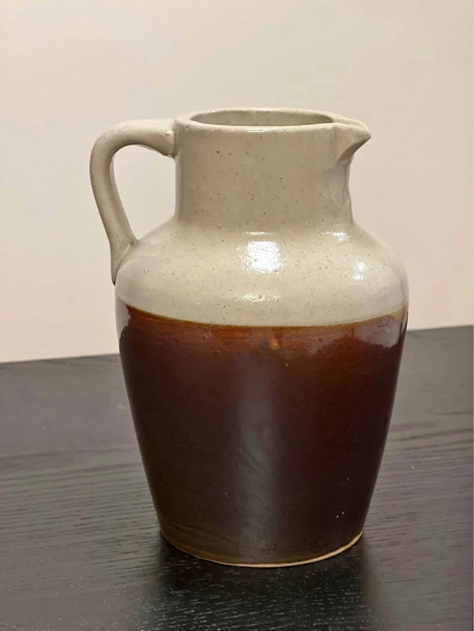 98This is a vintage two-tone stoneware pitcher, often referred to as a "dipped glaze" pitcher. These types of pitchers were commonly used in farmhouses for serving liquids like cream, milk, or syrup. The pitcher features a brown glaze on the lower portion and a lighter, beige or off-white glaze on the top. It is typically made from thick, heavy stoneware. Similar pieces are often identified as being from the late 19th century into the 20th century. The style is a classic example of early American pottery.