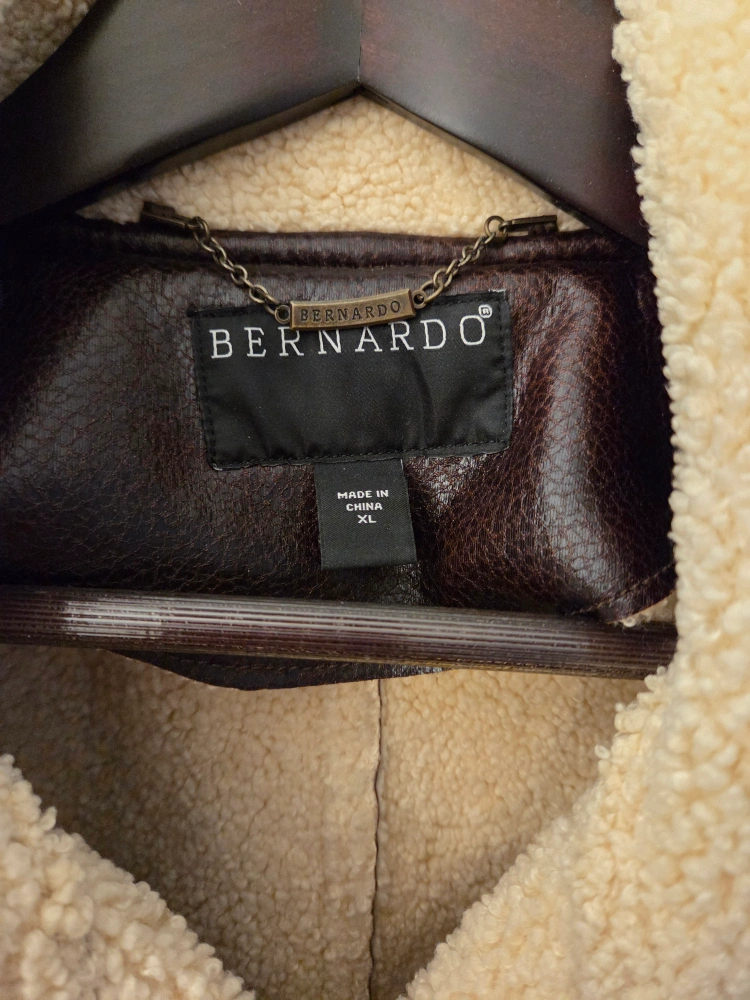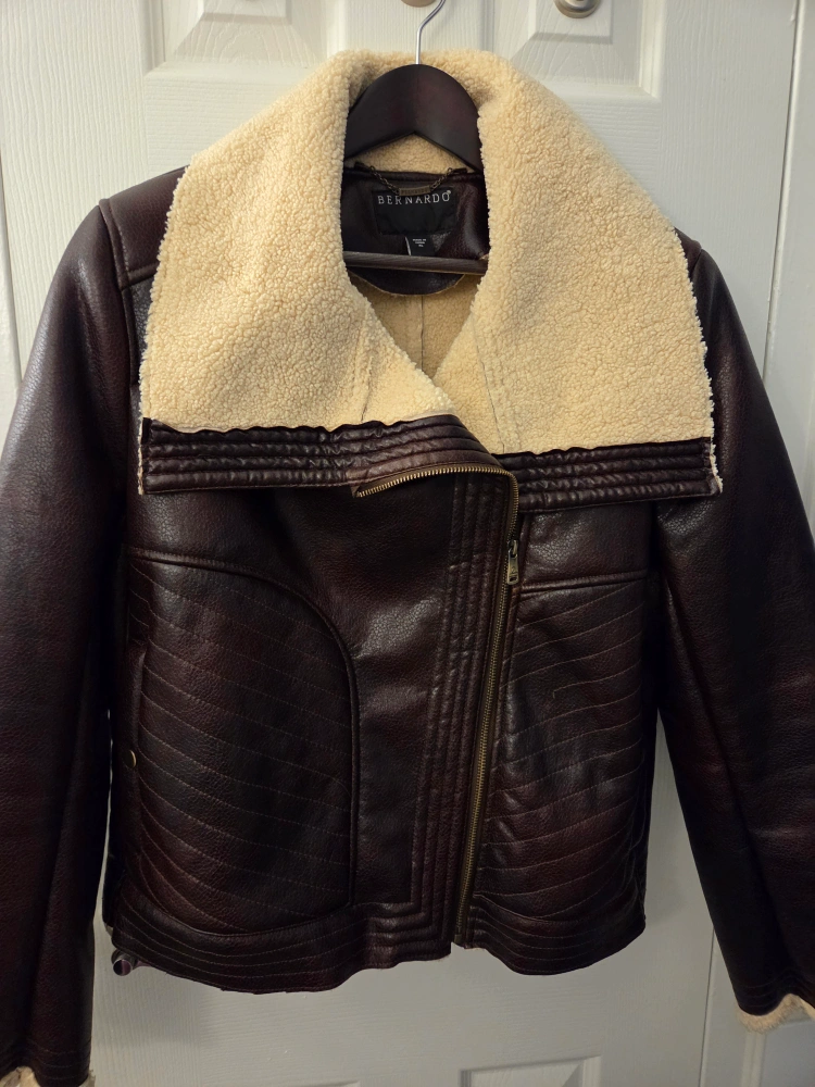 Women's Bernardo faux leather aviator jacket in size XL. The jacket is a dark brown colour with a cream-coloured sherpa lining on the collar and cuffs. It's in great condition and ready for a new home!