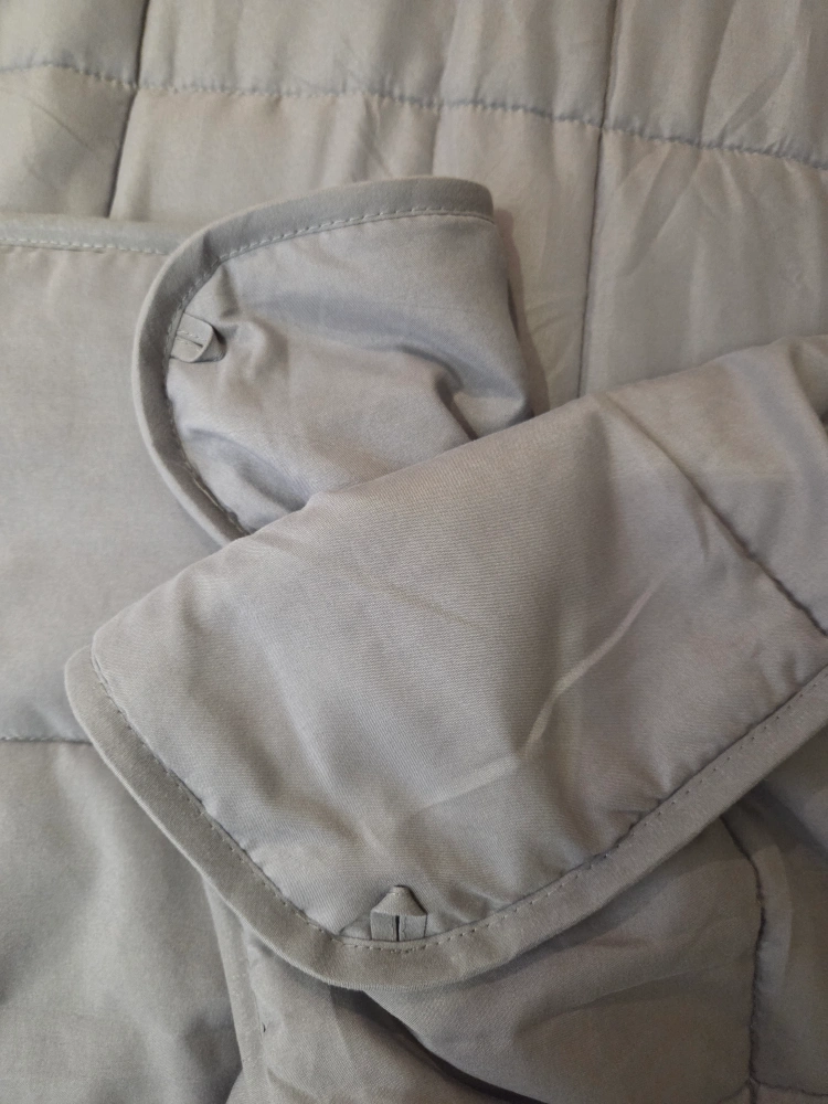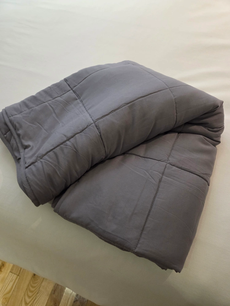 Selling a comfy grey weighted (10lbs) blanket! It's in excellent condition - used only once and was on top of the duvet (no direct body contact) and ready to help you relax. The 10lbs of weight is evenly distributed thanks to the quilted design. Perfect for a cozy night's sleep! **It's in a non smoking / no pets / no children home