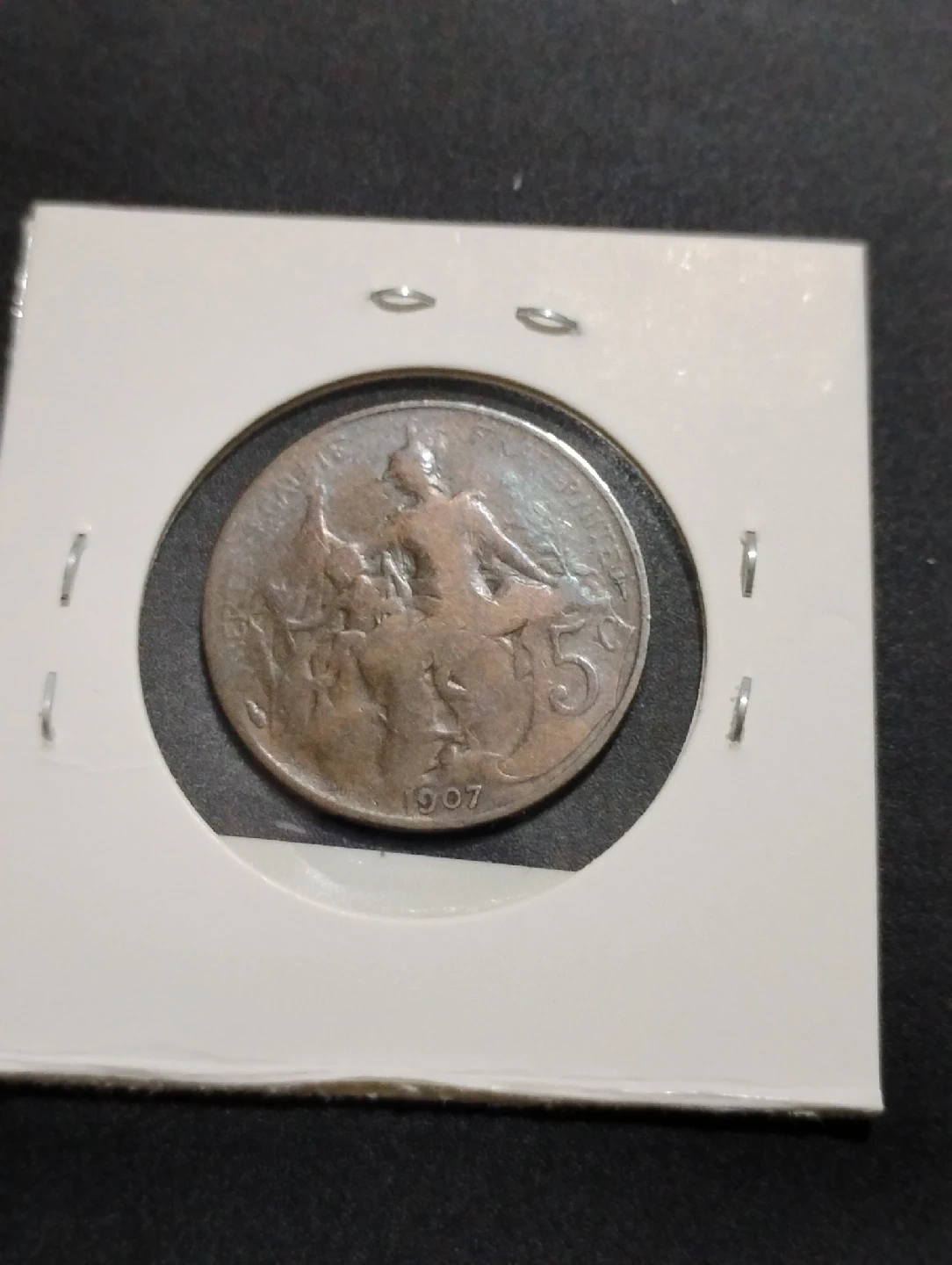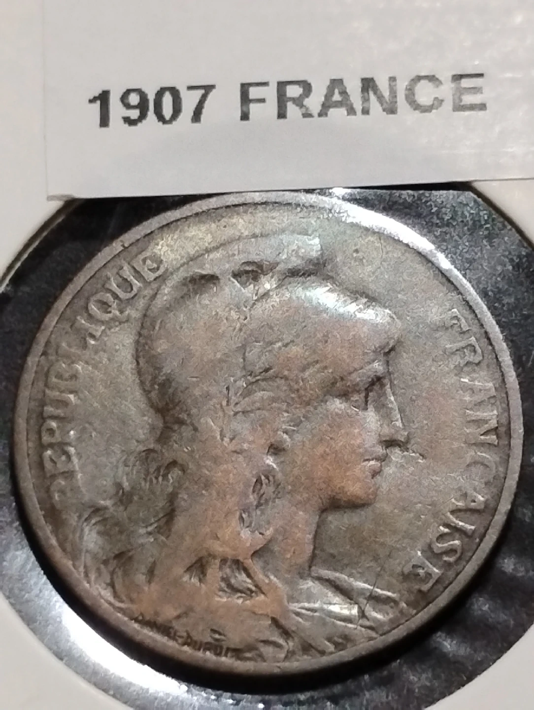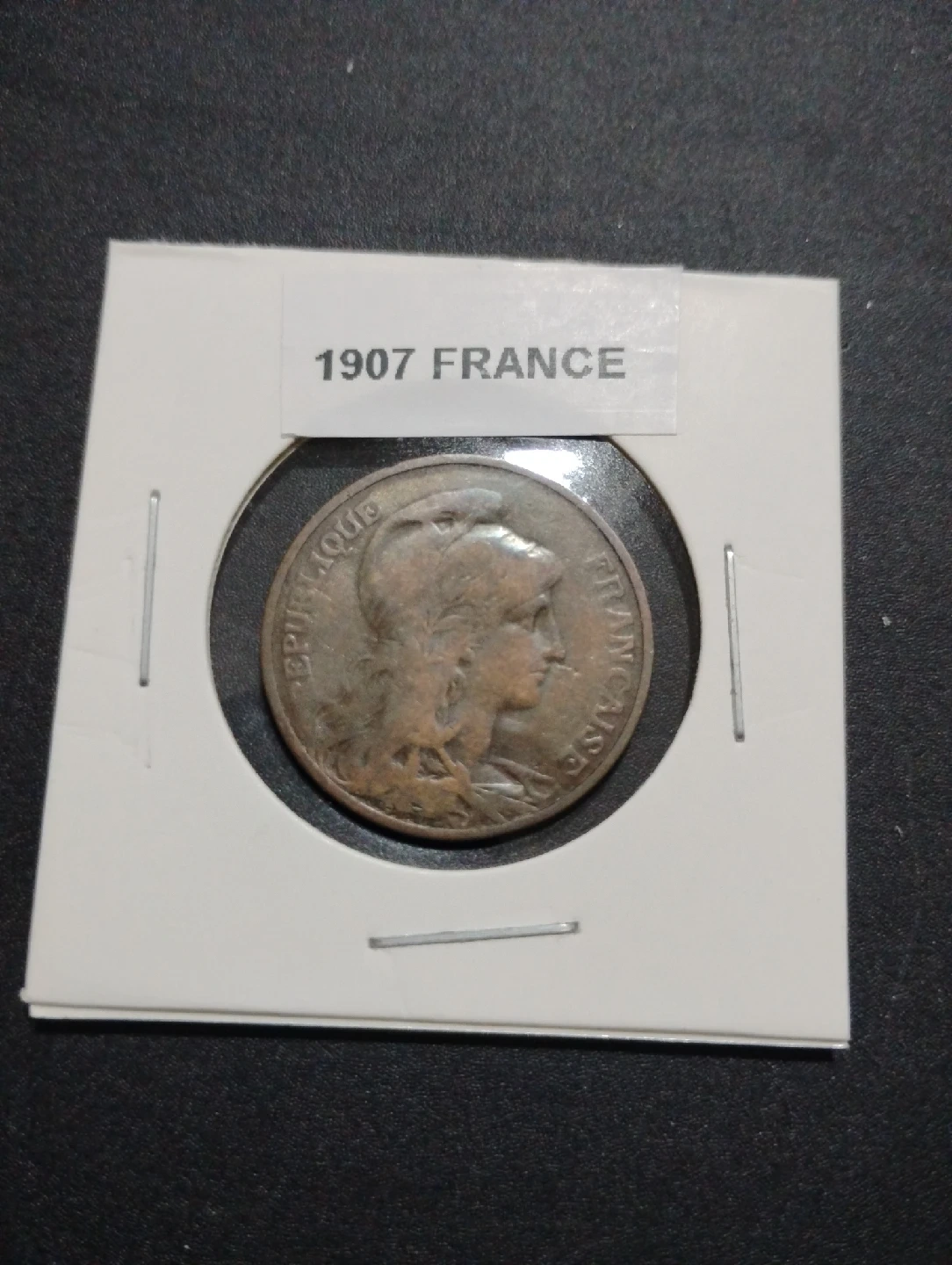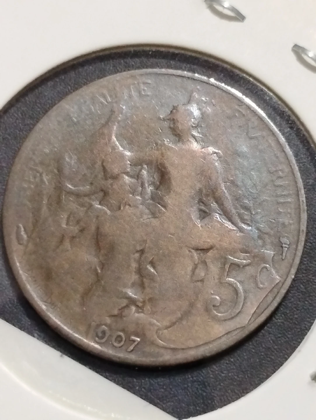 301Selling a 1907 French 5 centimes coin. It features a depiction of Marianne, a national symbol of France, and the coin's denomination. A piece of history!