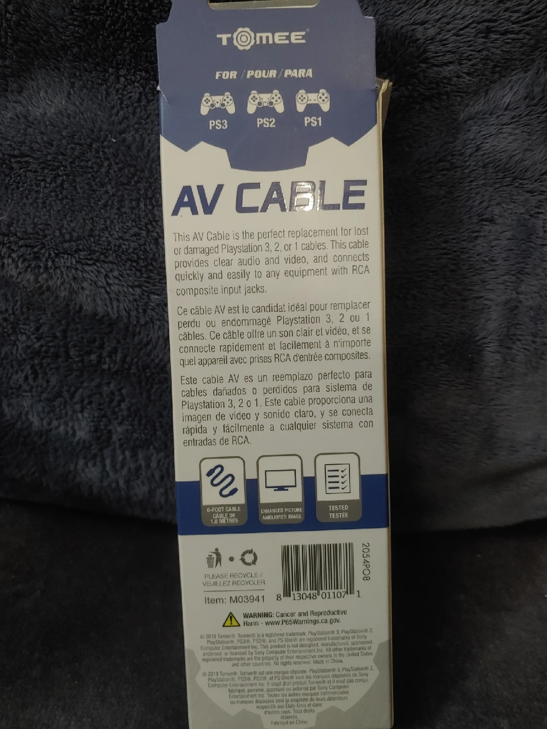 315Selling a brand new Tomee AV cable, still in its original box! This cable is compatible with PlayStation 3, PlayStation 2, and PlayStation 1 consoles. It's a 6-foot cable, providing ample length for connecting your console to your TV. Enjoy enhanced picture and audio quality with this cable