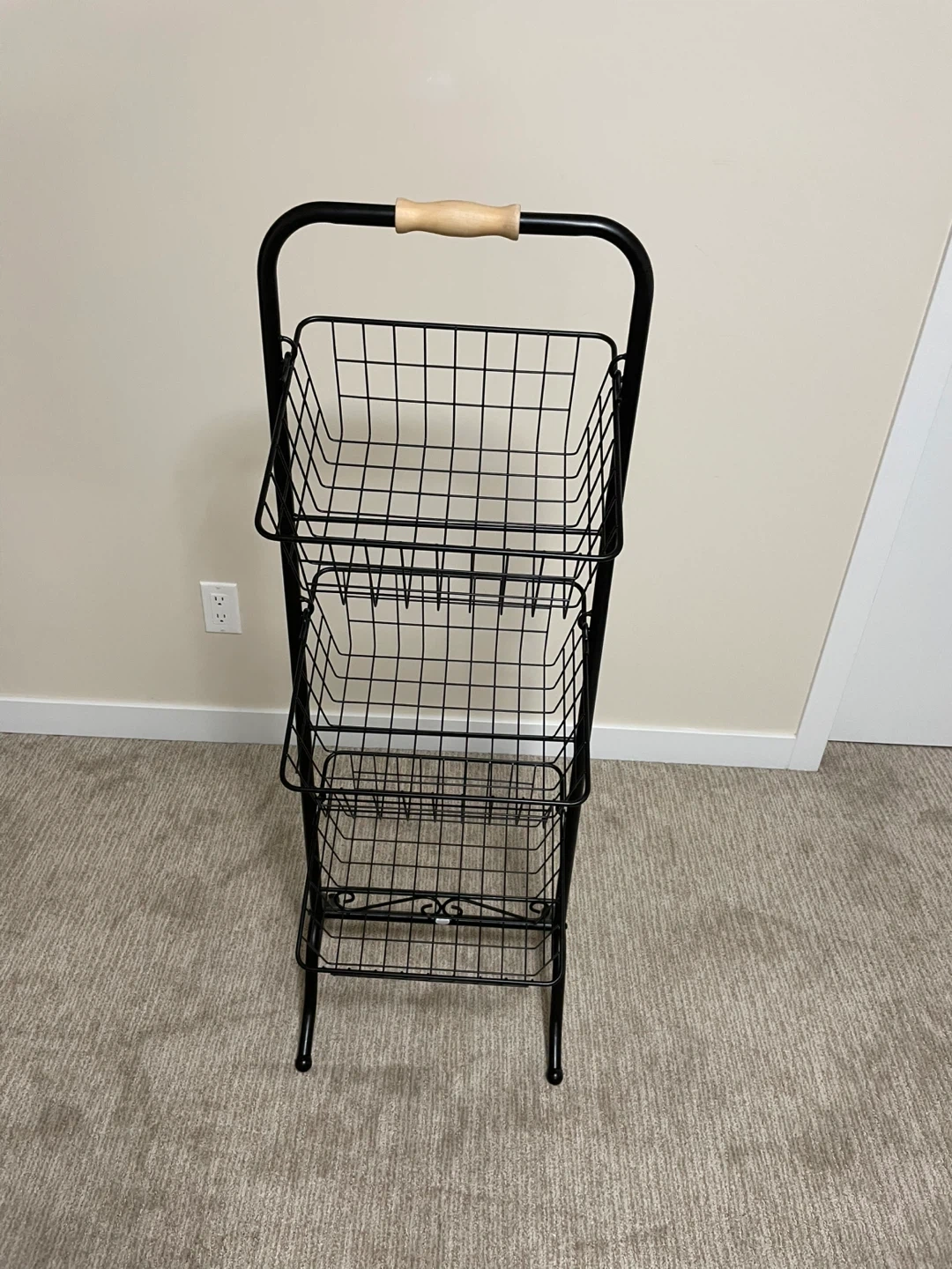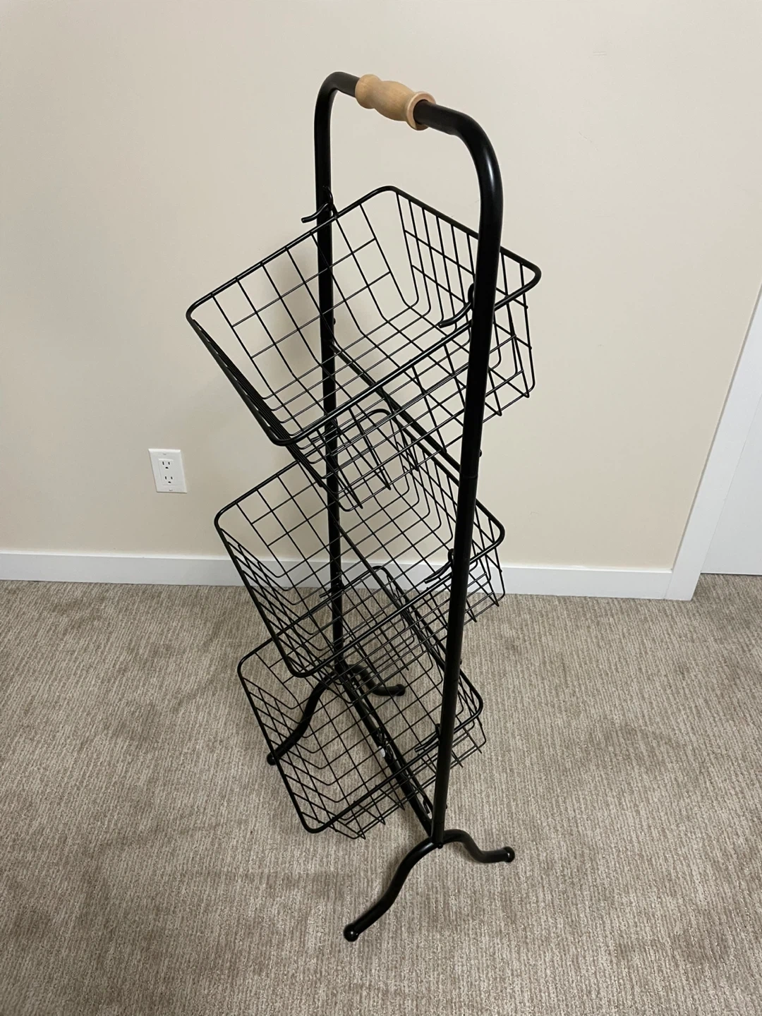This is a black metal basket stand with three tiers. It's great for storage in the kitchen, bathroom, or any room where you need a little extra organization! The baskets are wire and the frame is sturdy metal. It's easy to move around.