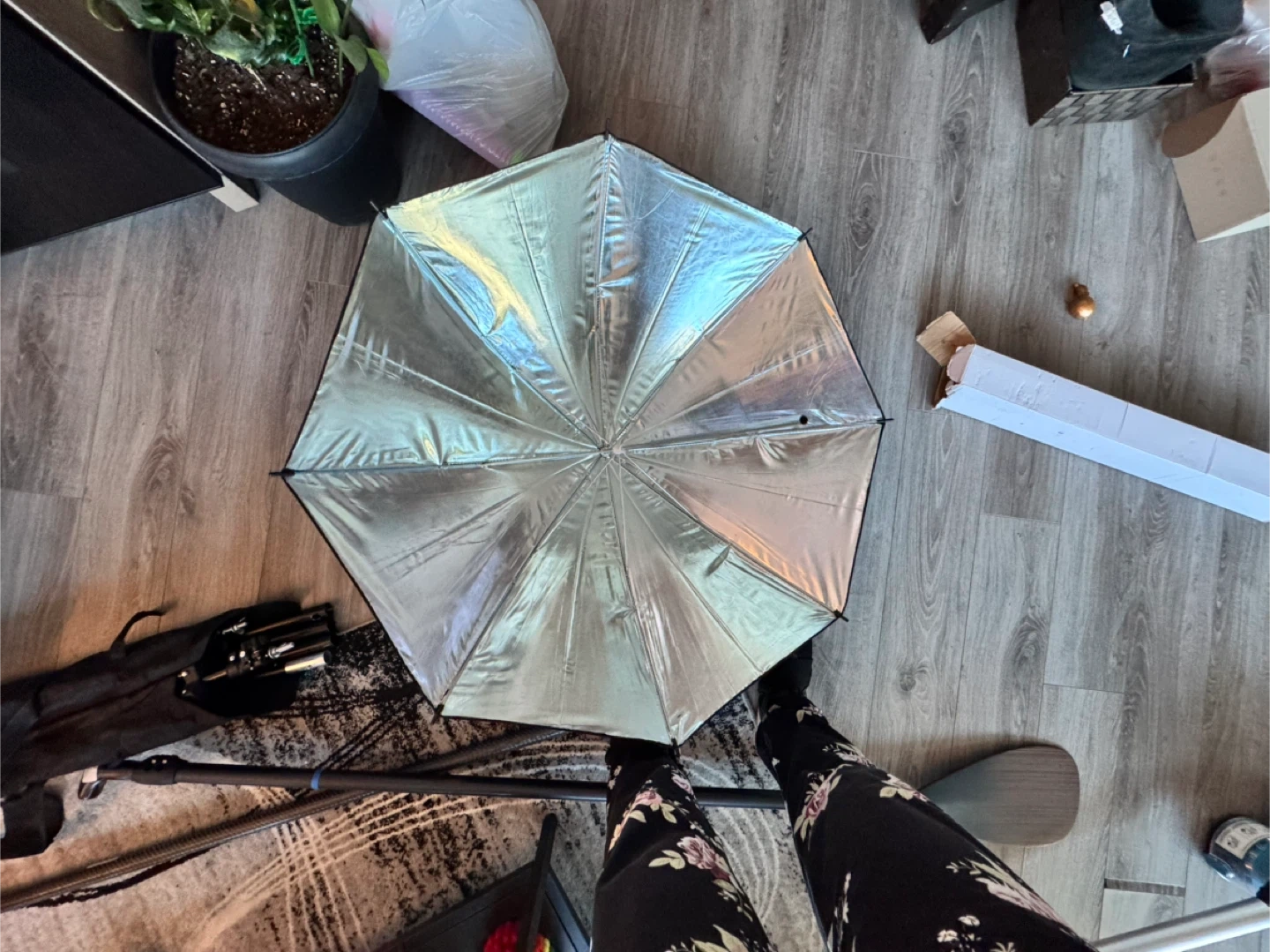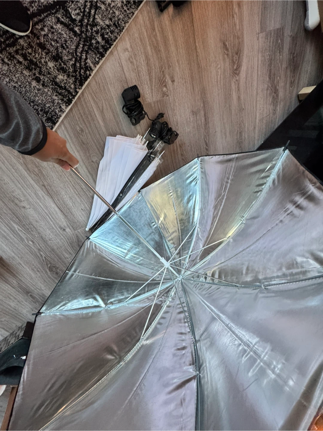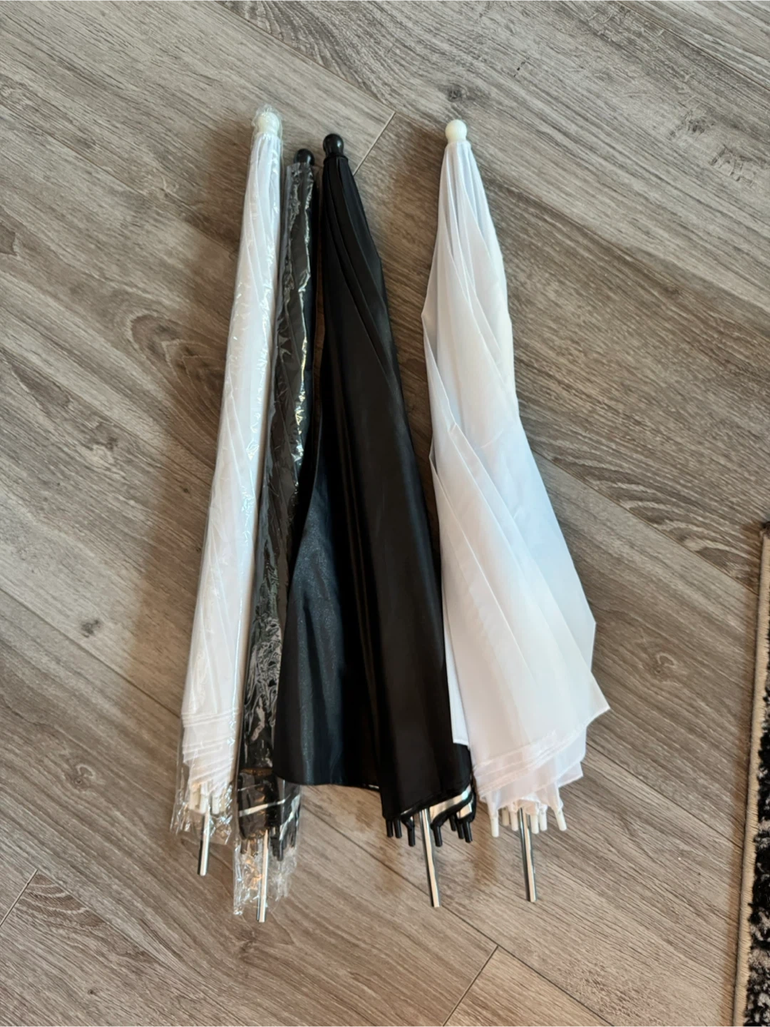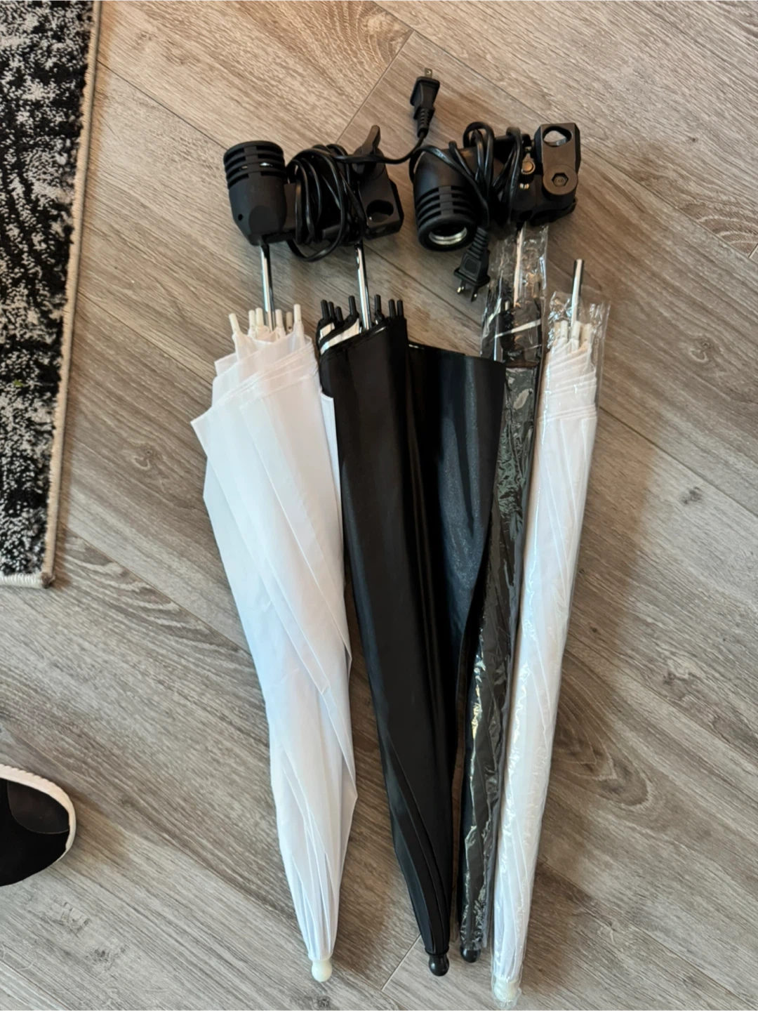 Selling a set of photography umbrellas! Includes white, black, and silver umbrellas, plus lightbulb and umbrella attachment. Great for studio lighting or on-location shoots.