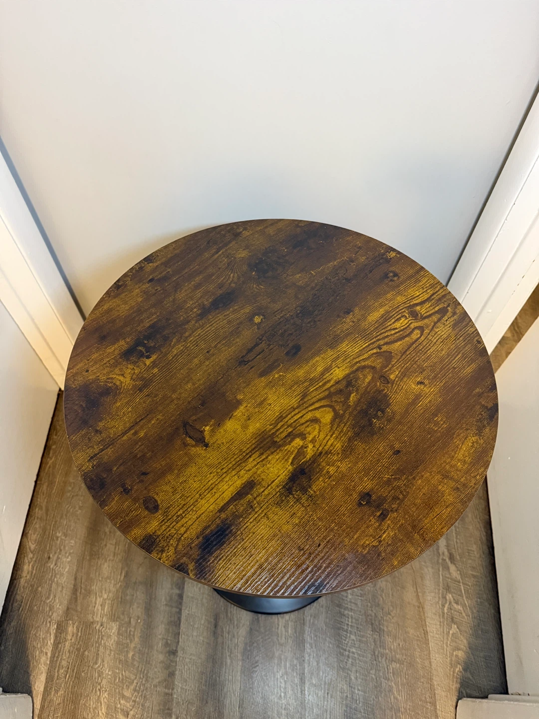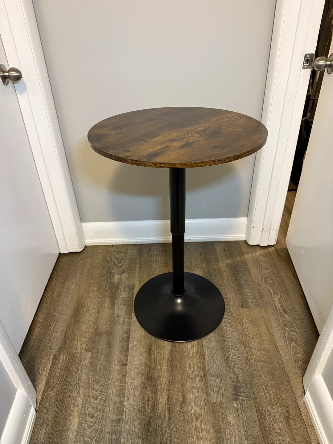 Looking to add a stylish touch to your space? Check out this round bar table! It features a dark brown wood-look top and a sleek black base. The height is adjustable, making it perfect for any setting. It's in great condition and ready for a new home