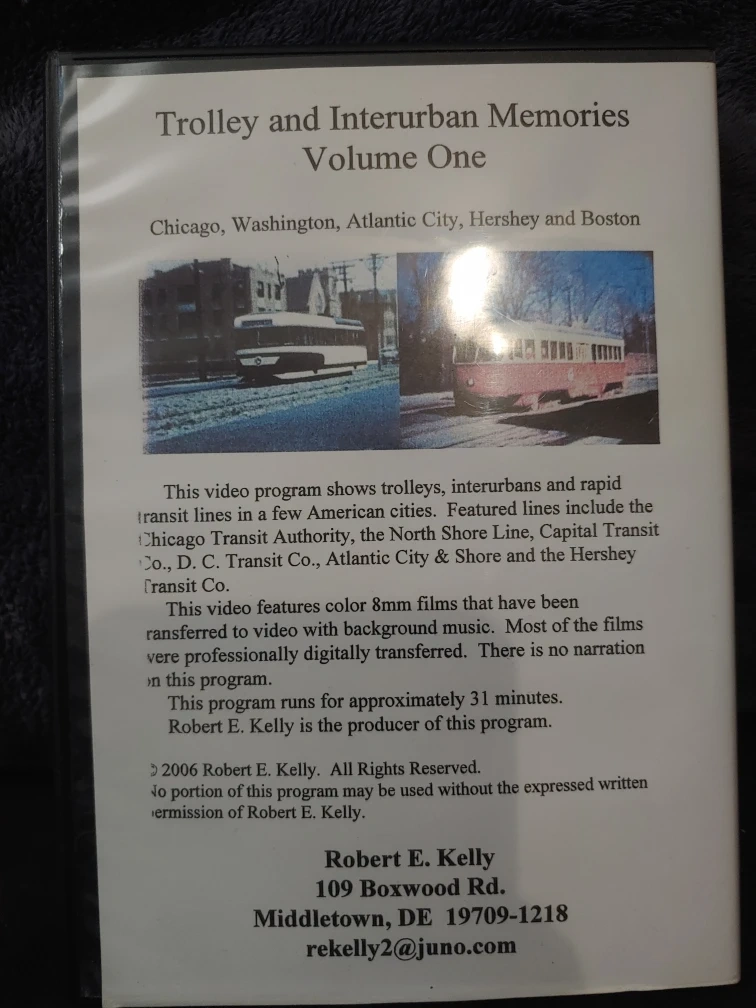 315Selling a DVD titled "Trolley and Interurban Memories Volume One". It features images of trolleys and interurbans in Chicago, Washington, Atlantic City, Hershey and Boston. This video program showcases trolleys, interurbans, and rapid transit lines in a few American cities. It also features color 8mm films that have been transferred to video with background music. The program runs for approximately 31 minutes