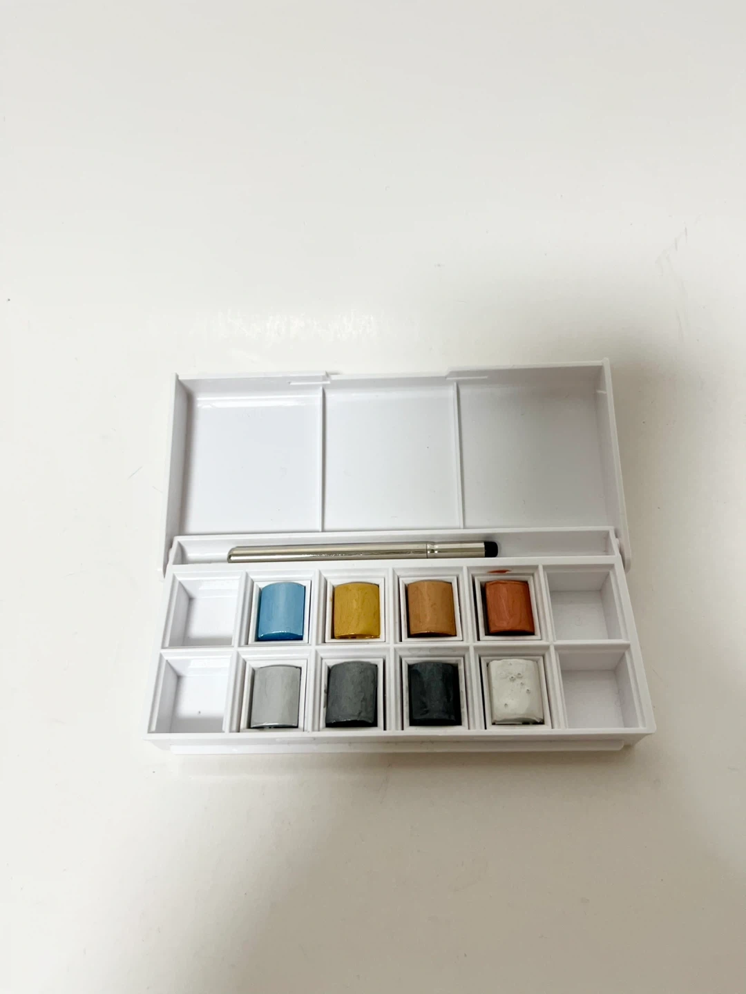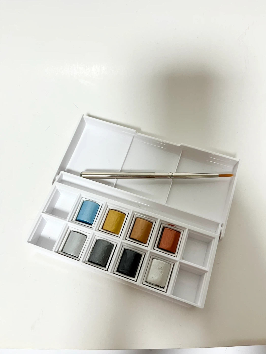 130Selling a set of Winsor & Newton metallic watercolours! Perfect for adding a shimmer to your artwork. The set includes a variety of metallic shades and a brush, all neatly organized in a palette. Add some sparkle to your next masterpiece!