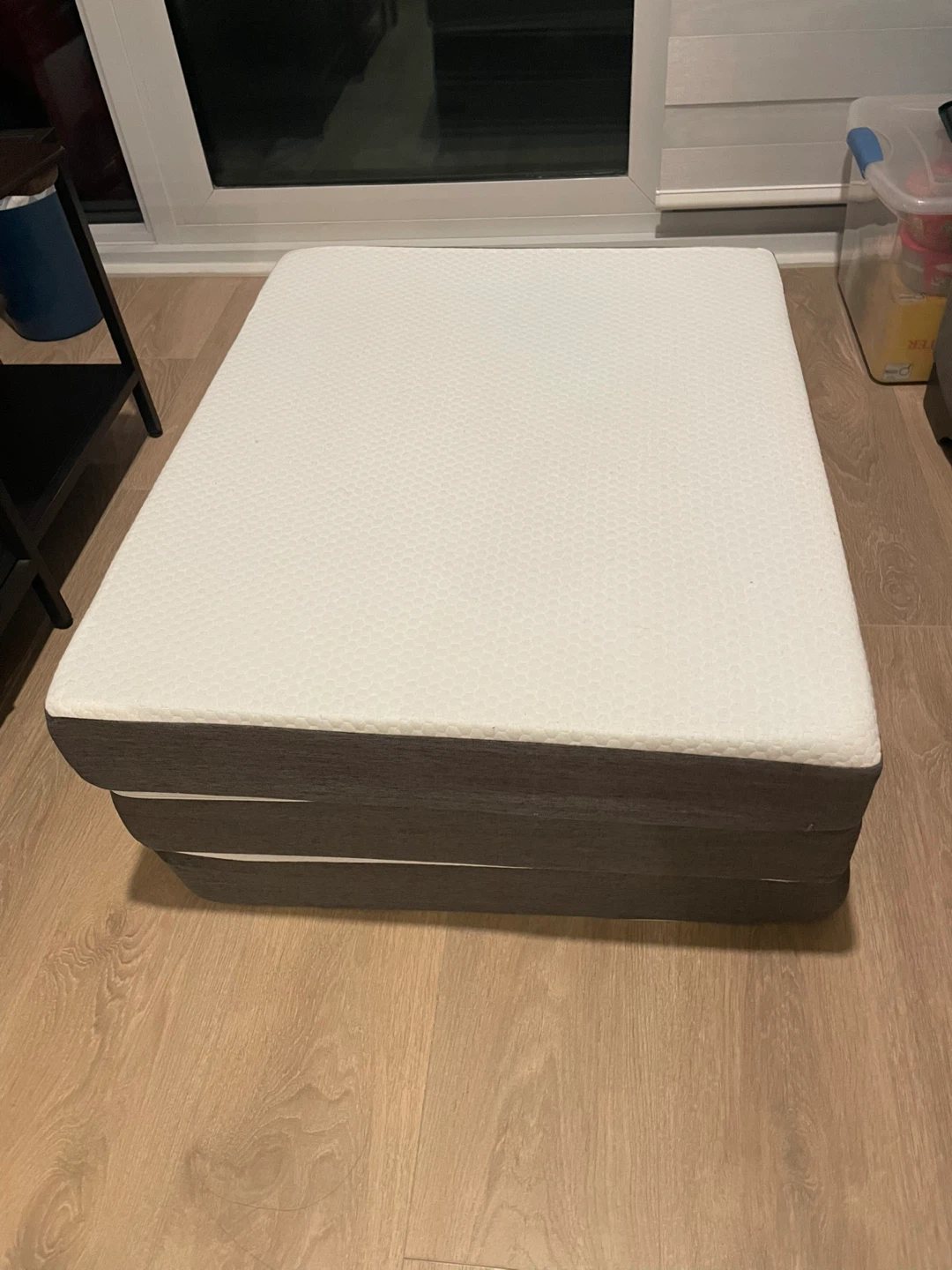 Selling a Twolike Narrow Twin (Single) folding mattress. It's a 4-inch tri-fold memory foam mattress with a washable cover. It also has a foldable mattress topper with a non-slip bottom and pressure relief. I used it for three months and I always used it with blankets on top. Dimensions are 75" x 31" x 4".