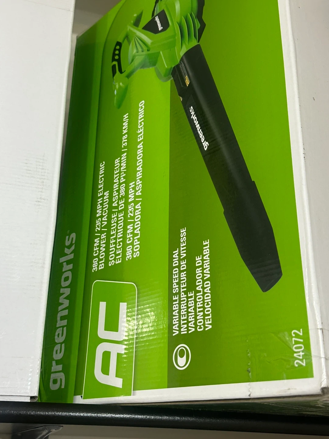 10Selling a Greenworks electric blower/vacuum. It has a variable speed dial and can blow at 380 CFM / 235 MPH. It can also be used as a vacuum!